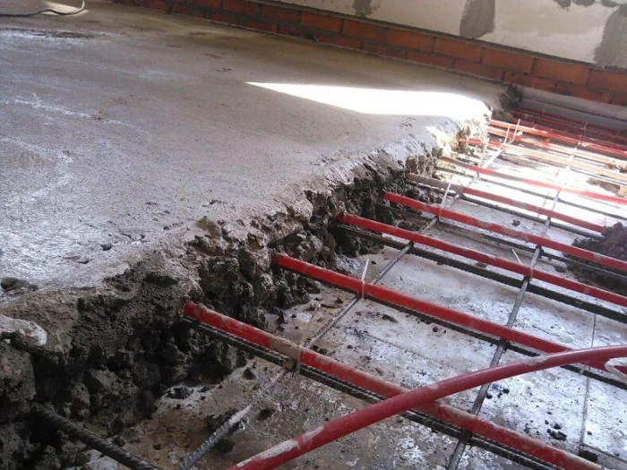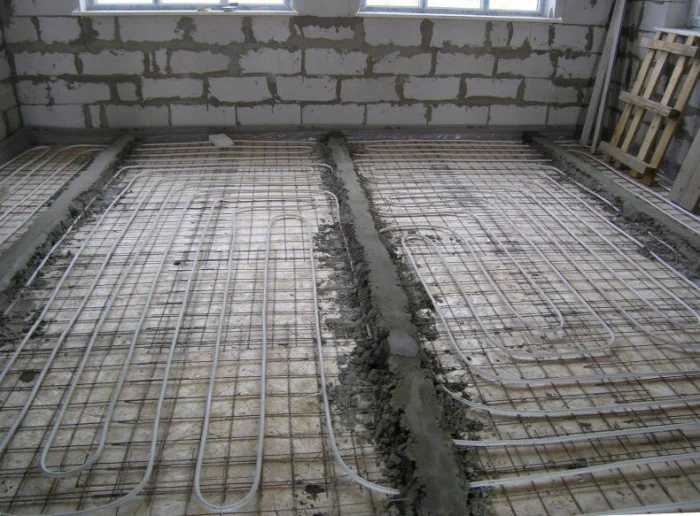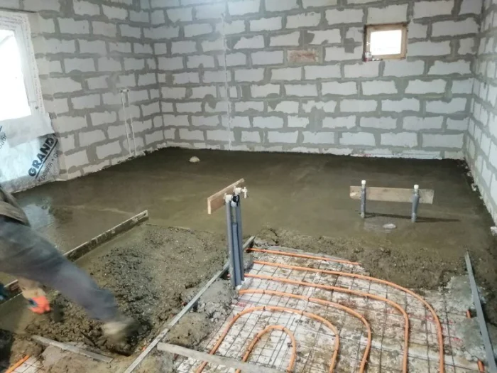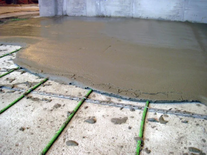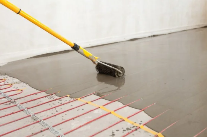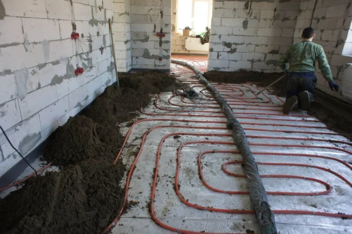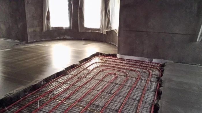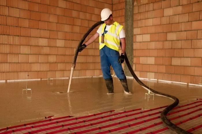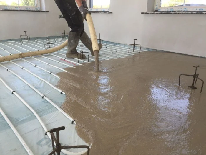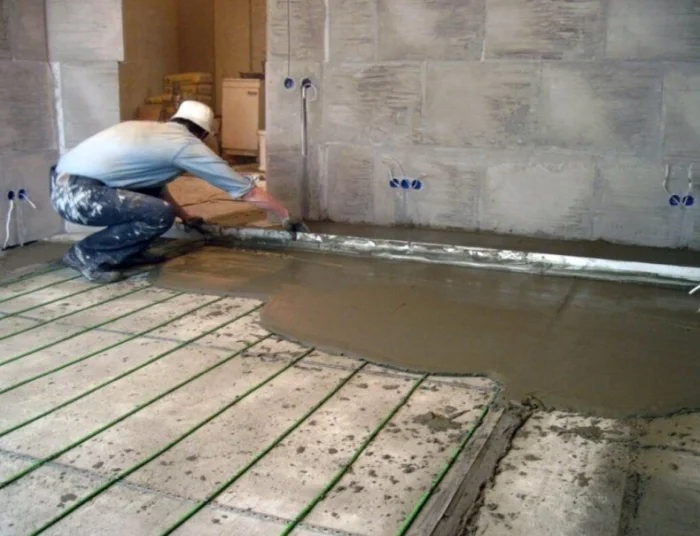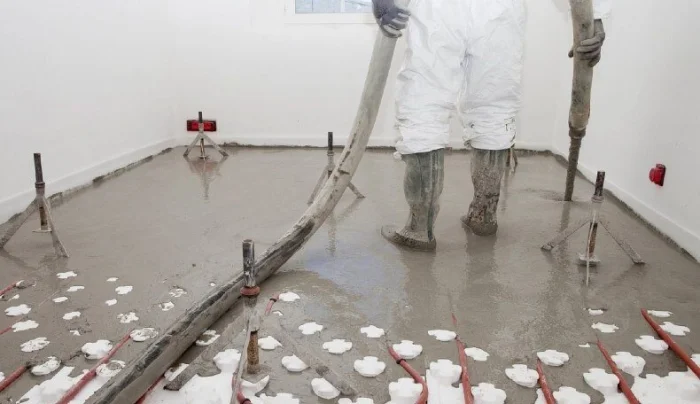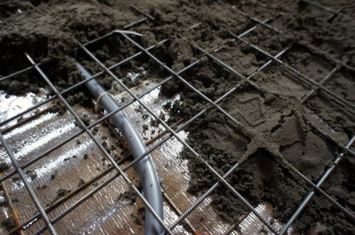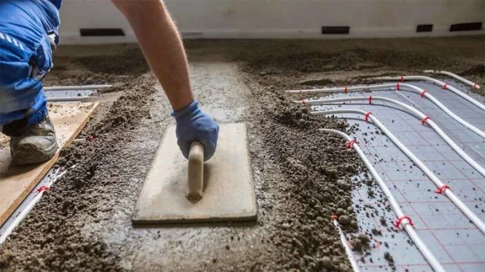 При монтаже, например, полов с подогревом, технология включает укладку теплоизоляционного слоя, армирующей сетки, труб или кабелей обогрева и только затем — заливку тёплой бетонной стяжки, которая будет аккумулировать и равномерно распределять тепло.