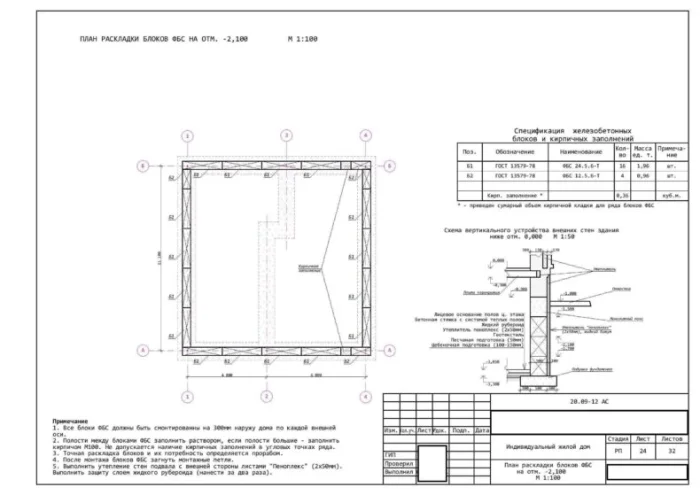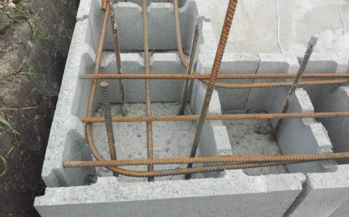 С блочным фундаментом есть особенность: часто арматурный каркас располагают не внутри каждого блока, а в монолитном железобетонном поясе (ростверке), который заливают поверх последнего ряда. Это самый правильный и надежный способ. Но иногда прутья нужно пропустить через блоки.