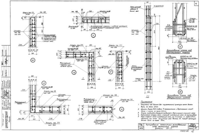 Самые нагруженные места в фундаменте — это углы и пересечения стен. Здесь нагрузка концентрируется. Поэтому арматуру в этих узлах усиливают: укладывают дополнительными хомутами, гнут специальным образом, чтобы прутья заходили на соседнюю стену. Это предотвращает расхождение углов.