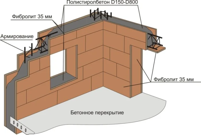 Стальные прутья закладываются в специальные пазы блоков или в швы между ними, а чаще — в монолитные пояса поверх блоков. Они работают в тандеме с бетоном: бетон прекрасно держит сжатие, а арматура — растяжение. Вместе они становятся железобетоном — одним из самых прочных искусственных материалов.