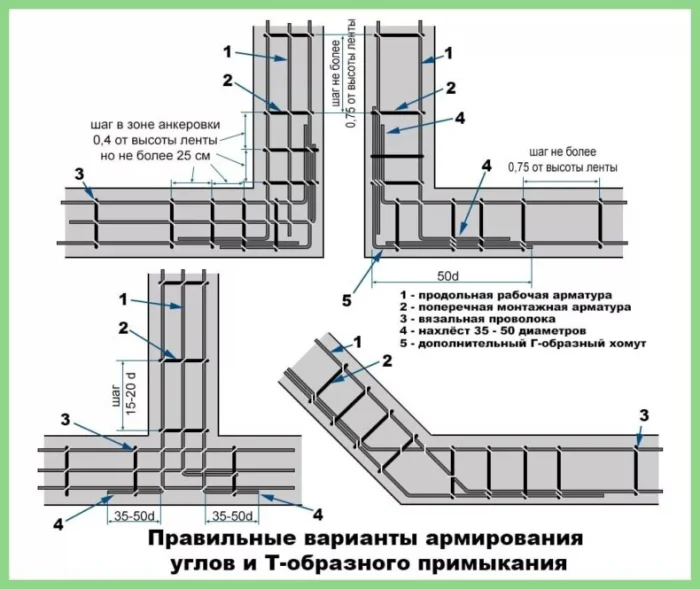 Связать углы. Мы уже говорили, что углы — слабое место. При вязке каркаса уделите им втрое больше внимания. Используйте Г-образные и П-образные хомуты.