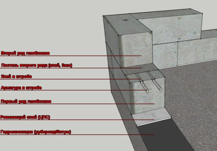 Особенно тщательно нужно изолировать место, где арматура может контактировать с внешней средой (например, выпуски арматуры для следующего этажа). Используйте обмазочные (битумные) или рулонные материалы, не забывая про гидроизоляцию под первым рядом блоков.