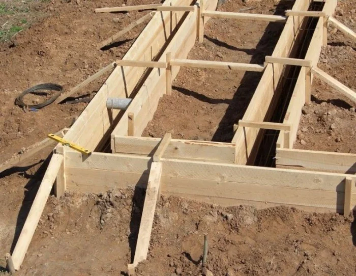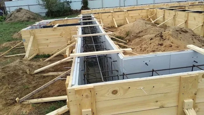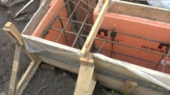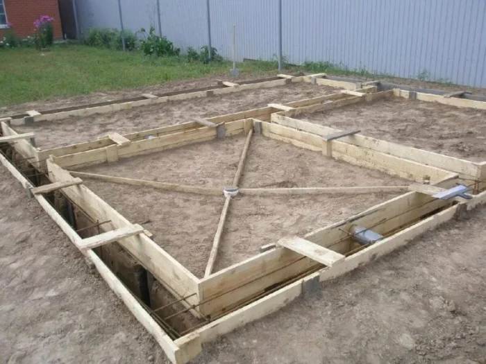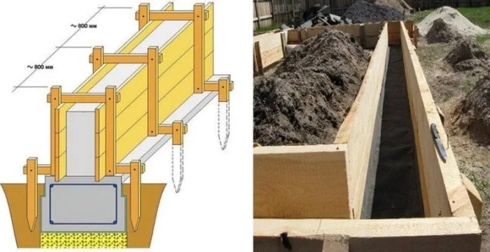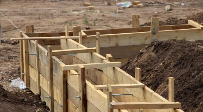 Опалубка должна быть прочной, чтобы выдержать давление бетона. Щиты из влагостойкой фанеры или обрезной доски сбиваются надежно, укрепляются распорками и укосинами. Внутренняя поверхность часто смазывается составом (например, отработкой), чтобы легче было снять щиты позже.