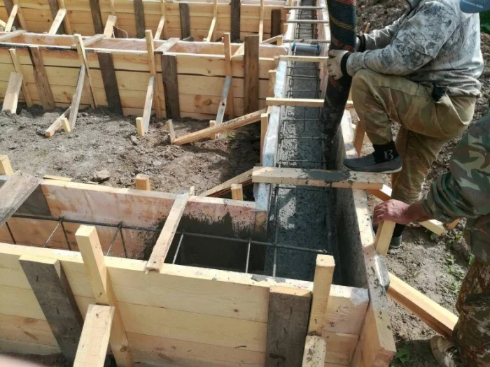 Бетон должен быть заводской, марки не ниже М250 (В20). Заливать нужно непрерывно, слоями, с обязательным уплотением глубинным вибратором. Это удалит пузыри воздуха и обеспечит монолитность. После заливки фундамент накрывают пленкой и в жаркую погоду поливают водой, чтобы бетон набирал прочность правильно, без трещин.