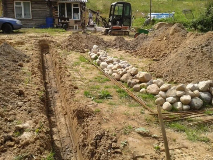 4. Подготовка основания траншеи. Дно выкопанной траншеи выравниваем, трамбуем и отсыпаем песчаной или щебеночной подушкой (15-20 см) с послойной трамбовкой. Это нужно для выравнивания и дренирования основания.