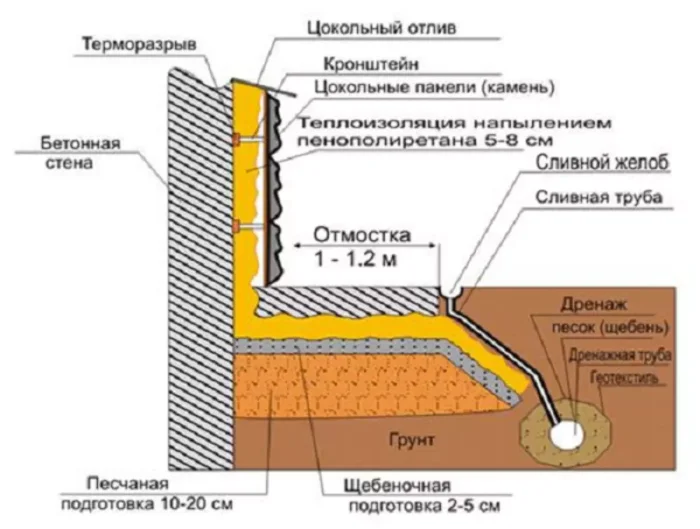 Особенно актуально для мелкозаглубленных фундаментов. По боковой стенке и под отмостку укладывают экструдированный пенополистирол (ЭППС, типа Пеноплекса). Он не боится воды и отлично держит тепло, не давая морозу «подобраться» к фундаменту.