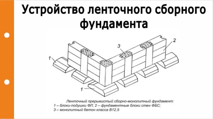 Готовые сваи, фундаментные блоки (ФБС), балки ростверков. Плюс: скорость монтажа (не надо ждать, пока застынет бетон). Минус: нужен кран, сложнее добиться монолитности, швы — слабые места для воды.