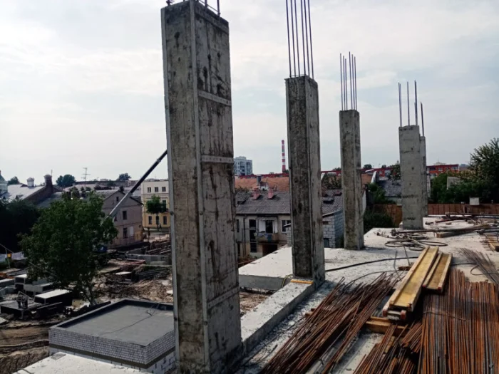 - Выверка. Самая ответственная часть. С помощью нивелира, теодолита и отвесов колонну выставляют строго вертикально в двух плоскостях. Фиксируют временными распорками (расчалками).