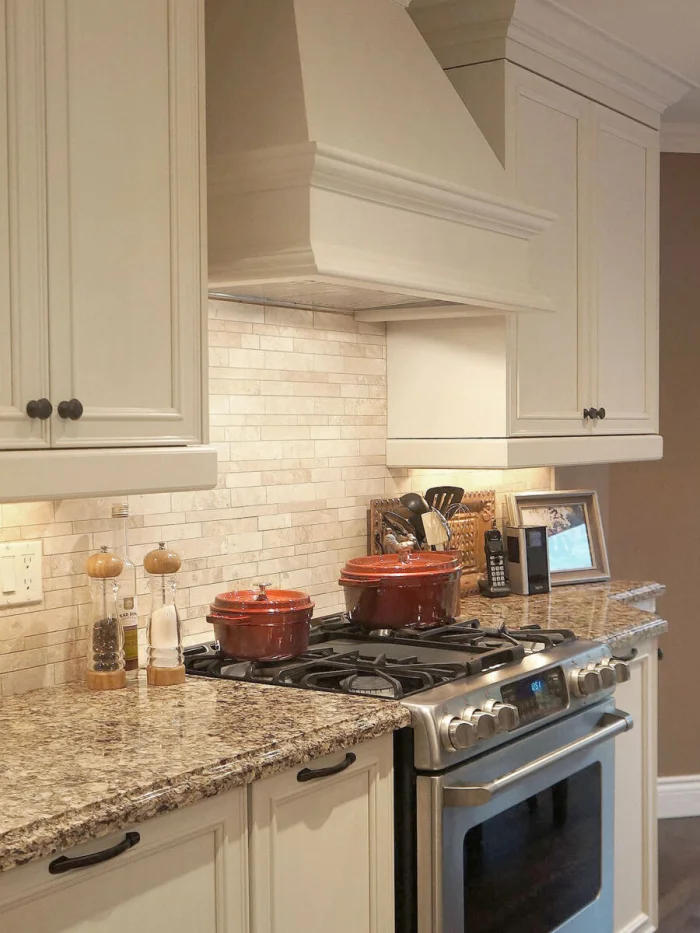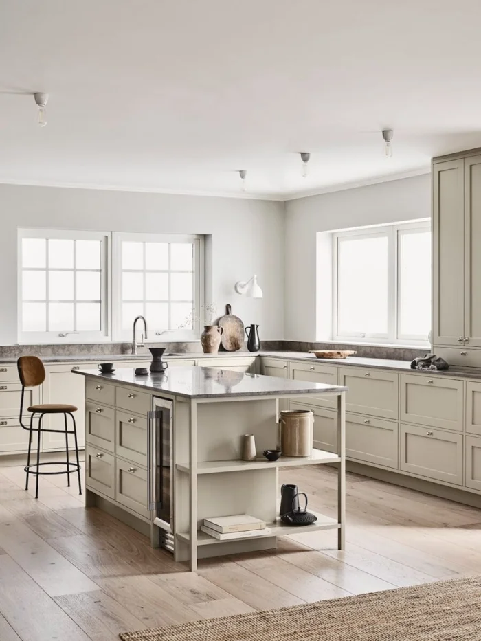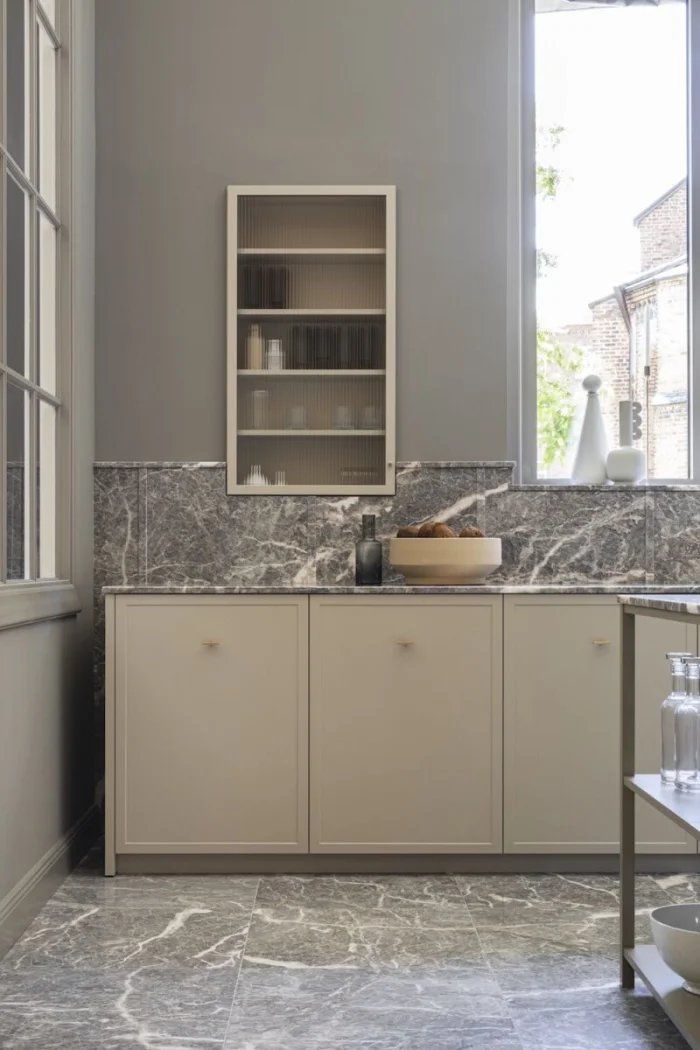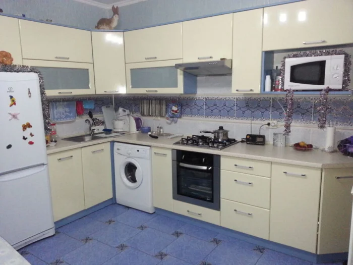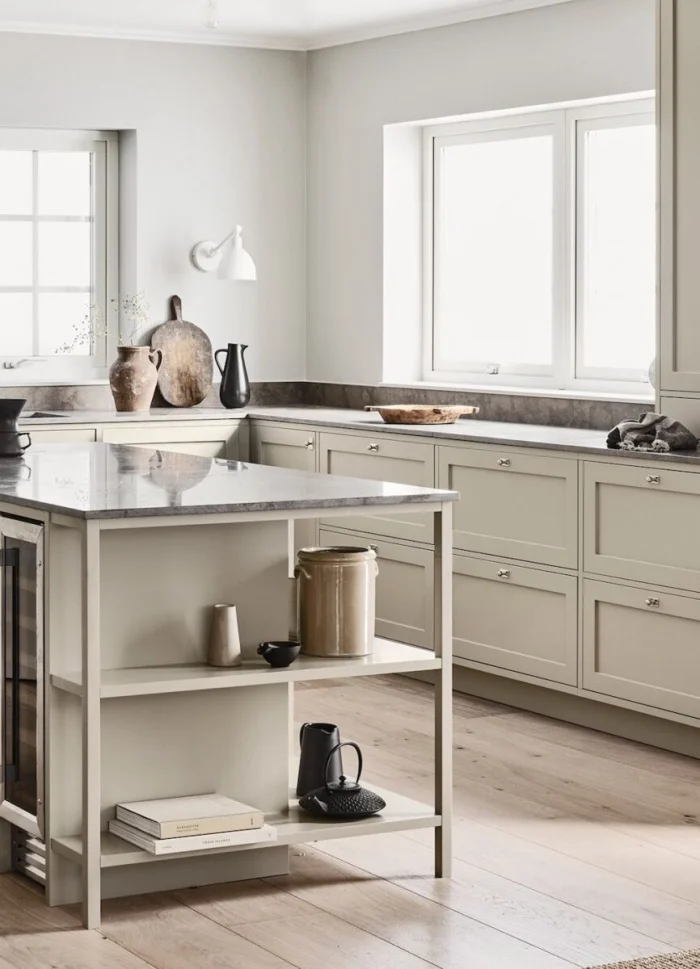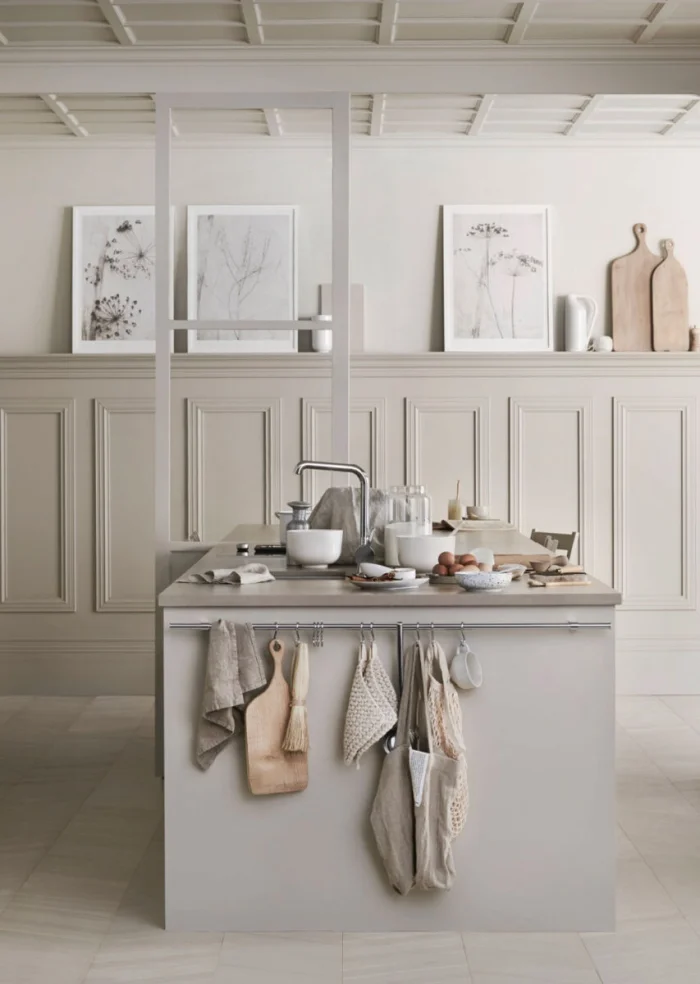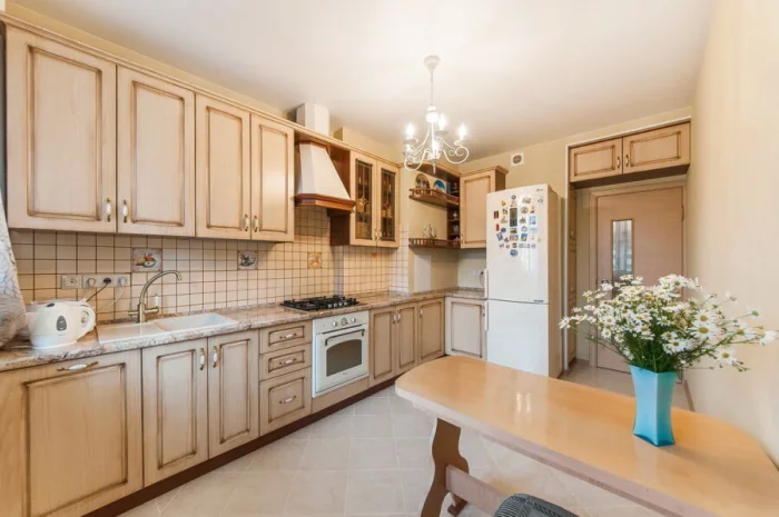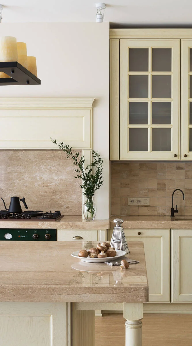 - Солнечная, южная кухня? Выбирайте оттенки с холодным подтоном (пепельно-бежевый, серо-бежевый). Мало света? «Согревайте» пространство теплыми тонами (кремовый, карамельный, песочный).