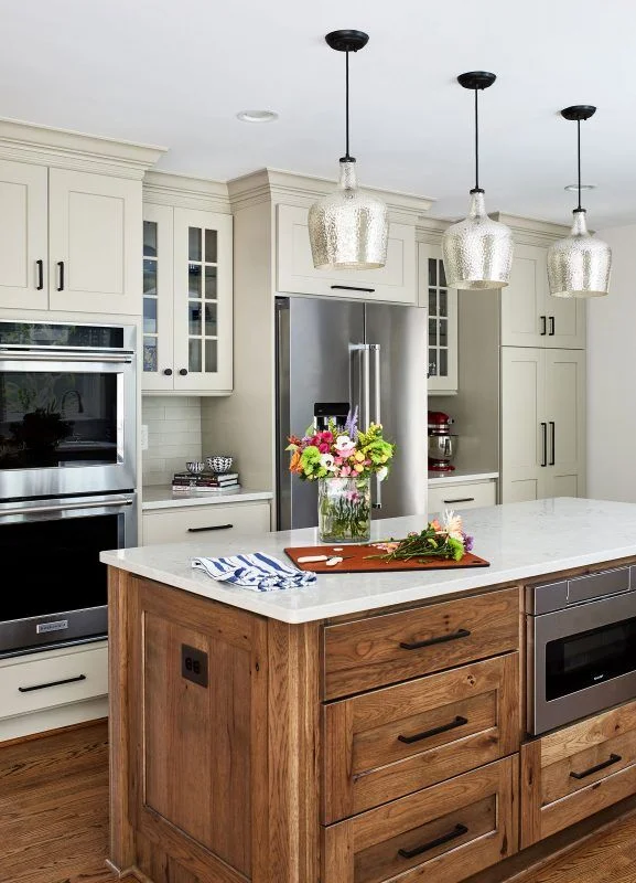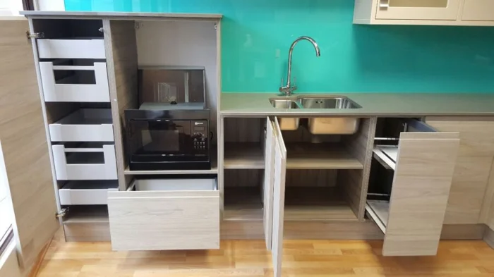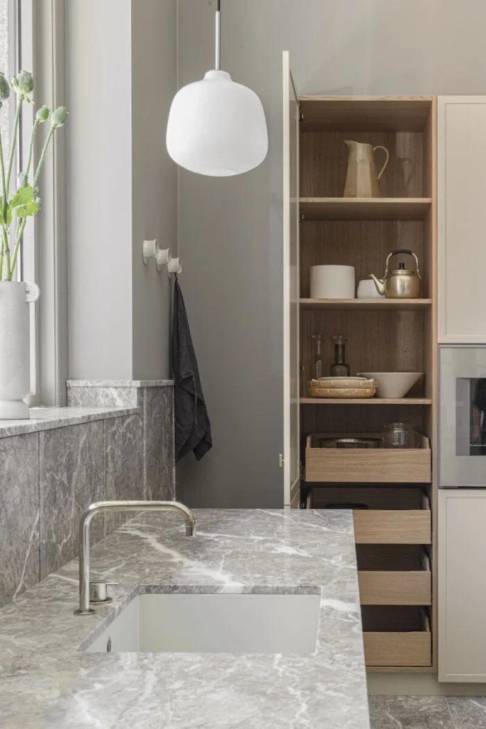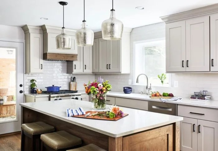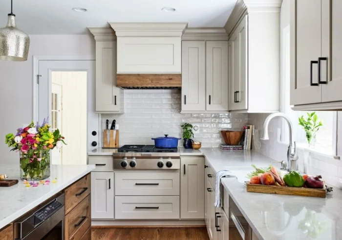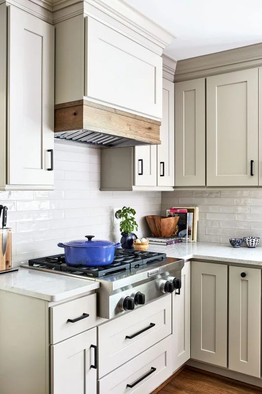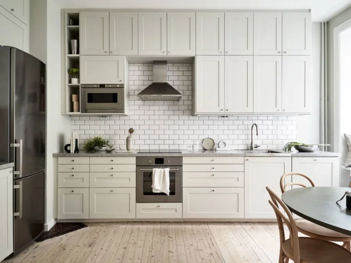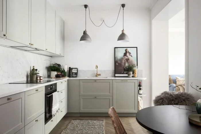 Переходы могут быть резкими (с помощью цвета мебели или фартука) или плавными, созданными с помощью игры близких друг к другу полутонов.