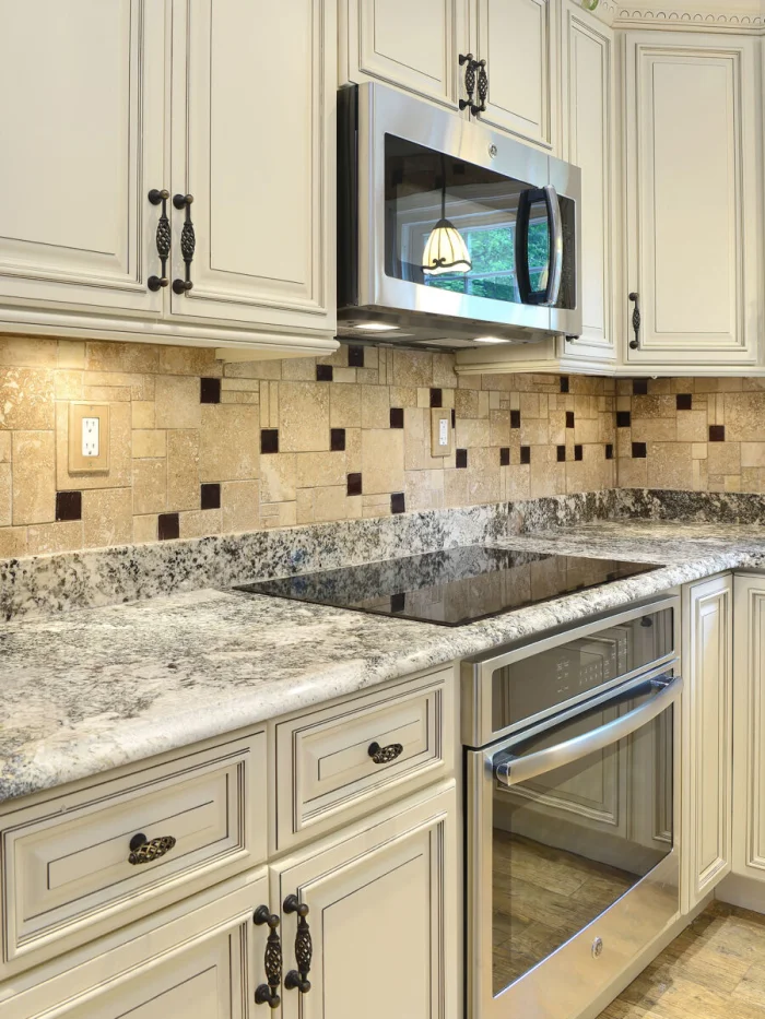 Плитка – это поле для экспериментов. Попробуйте сочетать коричневые и серые модули, перекликаясь по цвету со столешницей или фартуком. Получится стильно и динамично.