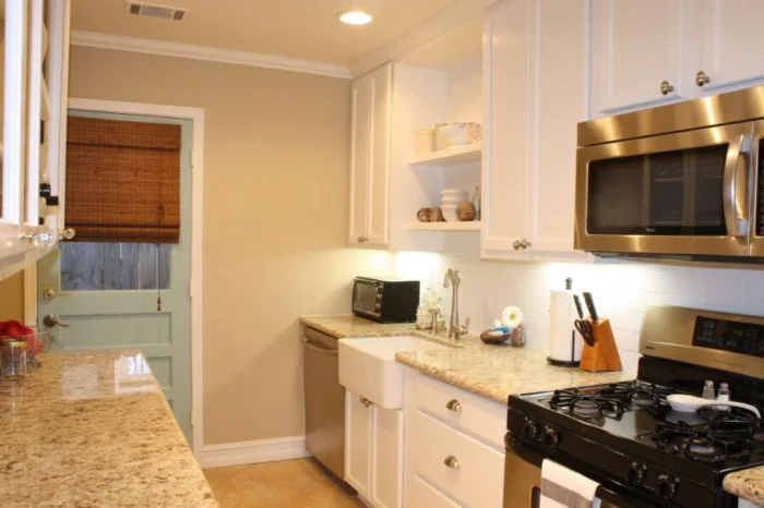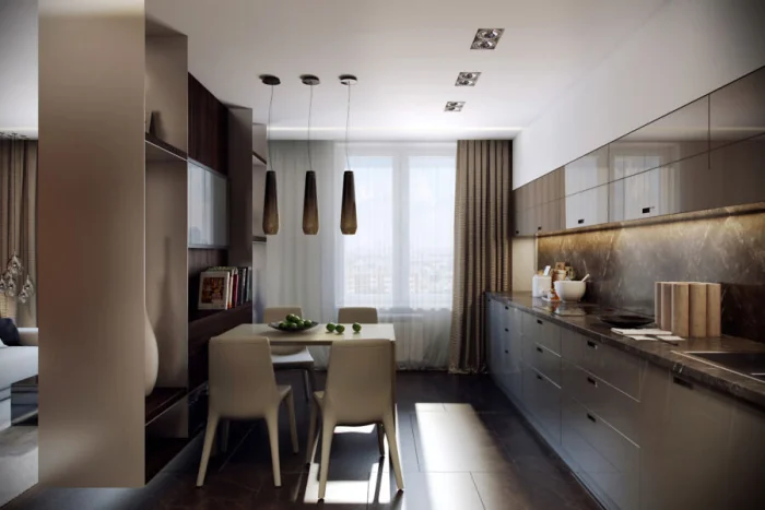 Бежевый – мастер тонких градаций. Зону отдыха (столовую) можно обозначить более светлым, воздушным оттенком. Рабочую же часть – выделить на пару тонов темнее или добавить к ней контрастного цвета.