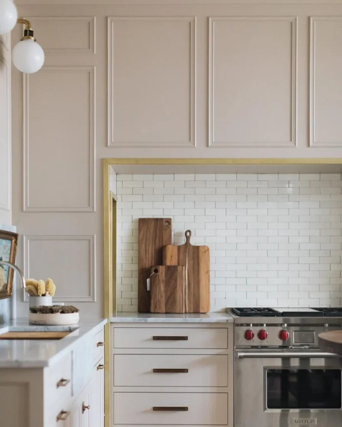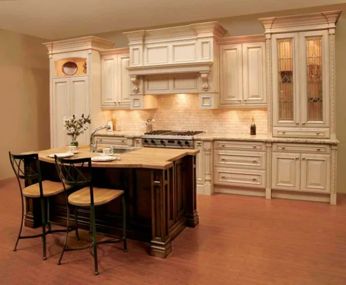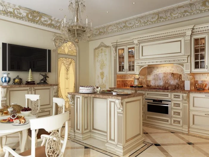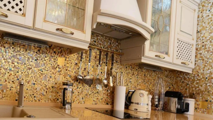 В классической кухне она может позволить себе больше: кованые элементы, позолота, медные акценты. Она уже не просто техника, а часть декора.