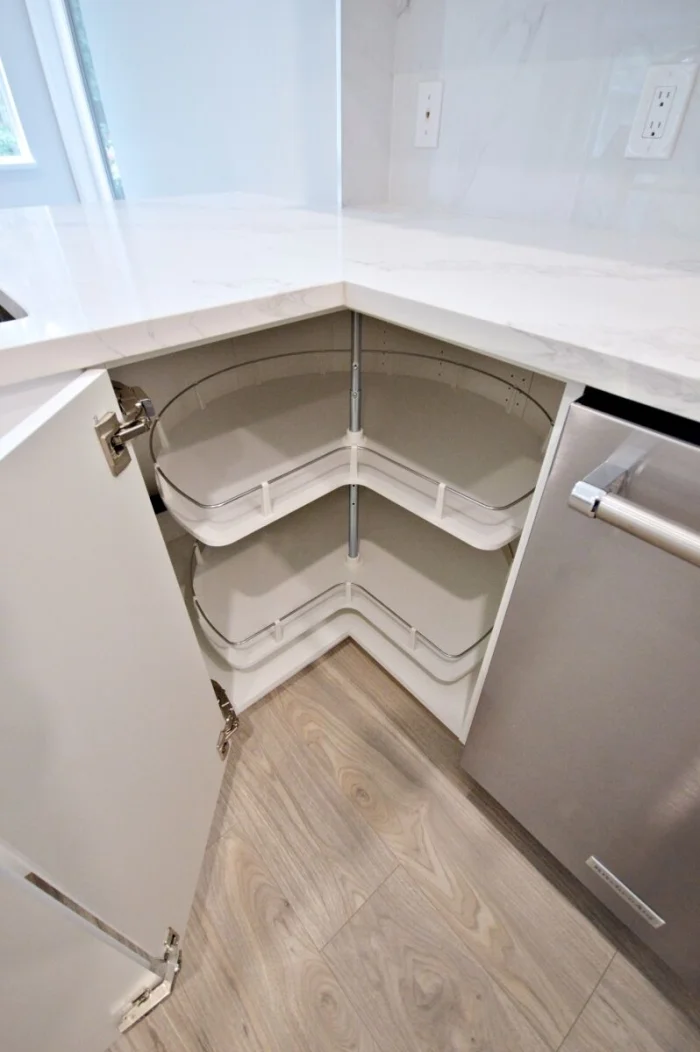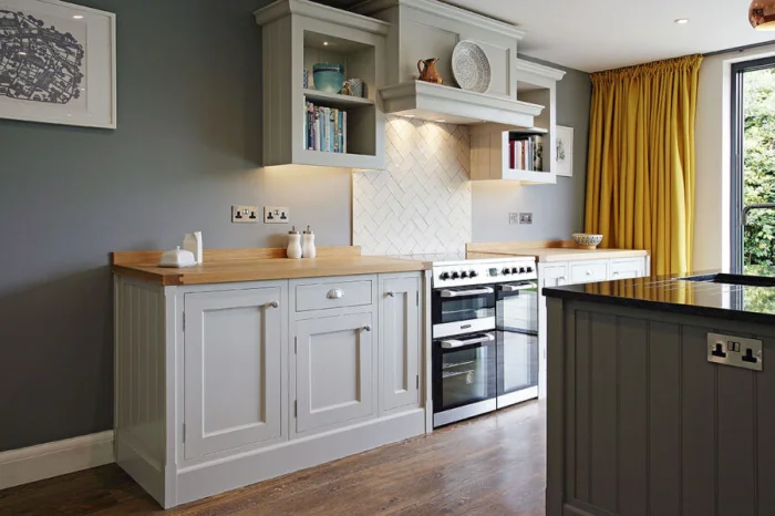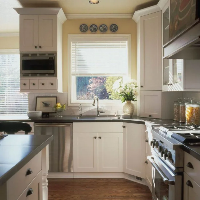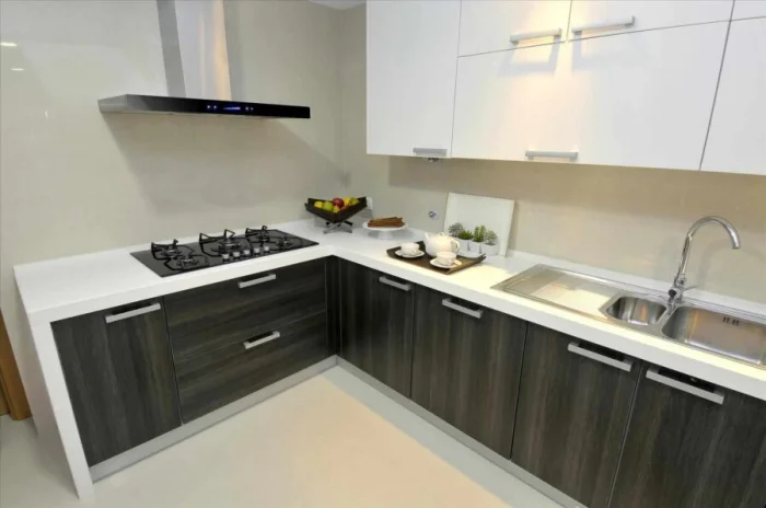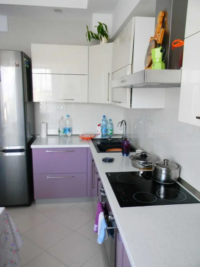Г-образная. Безусловный хит и фаворит для помещений любых размеров. Эффективно использует угол, создавая удобный рабочий треугольник и оставляя много свободного пространства по центру. Подходит и для скромной кухни в «хрущевке», и для просторной кухни-гостиной.