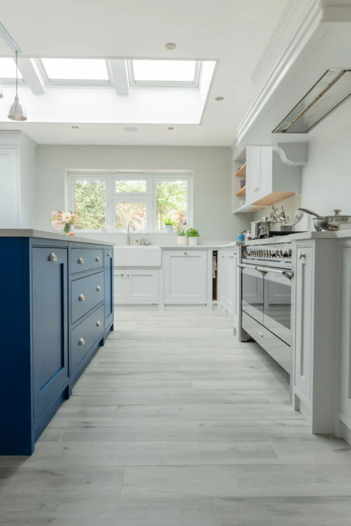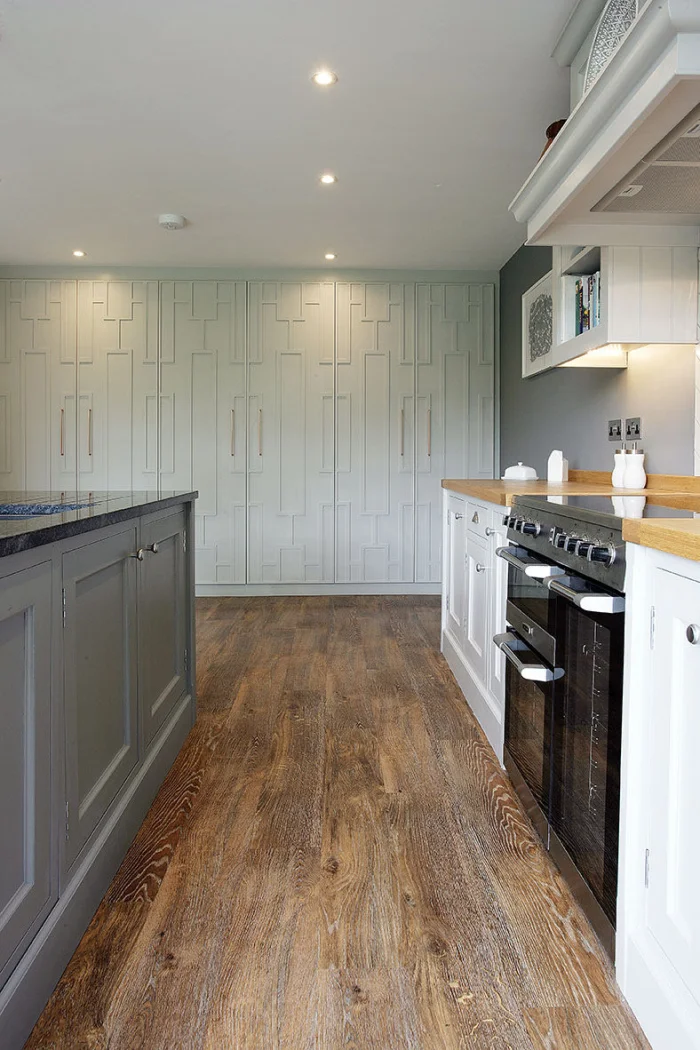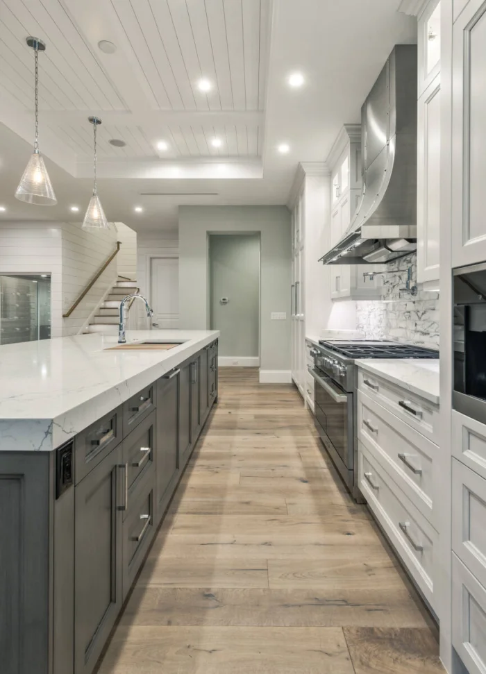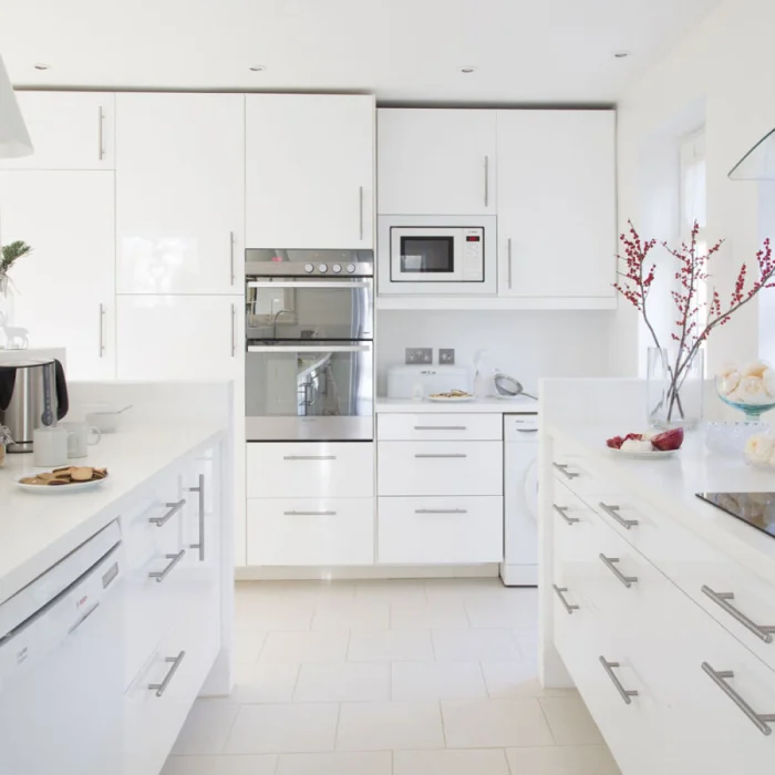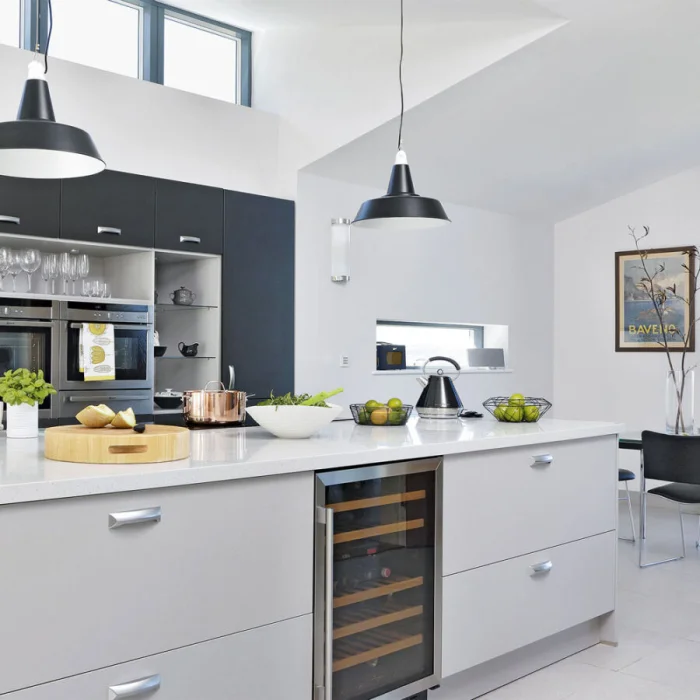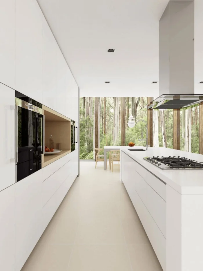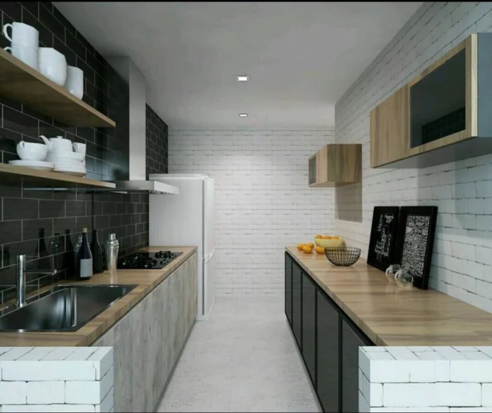 Двухрядная. Решение для длинных и узких помещений или проходных кухонь. Шкафы и техника располагаются вдоль двух противоположных стен. Обычно на одну сторону «посадите» мойку с плитой, а на другую — холодильник и блоки хранения.