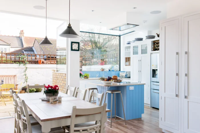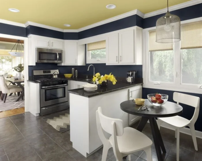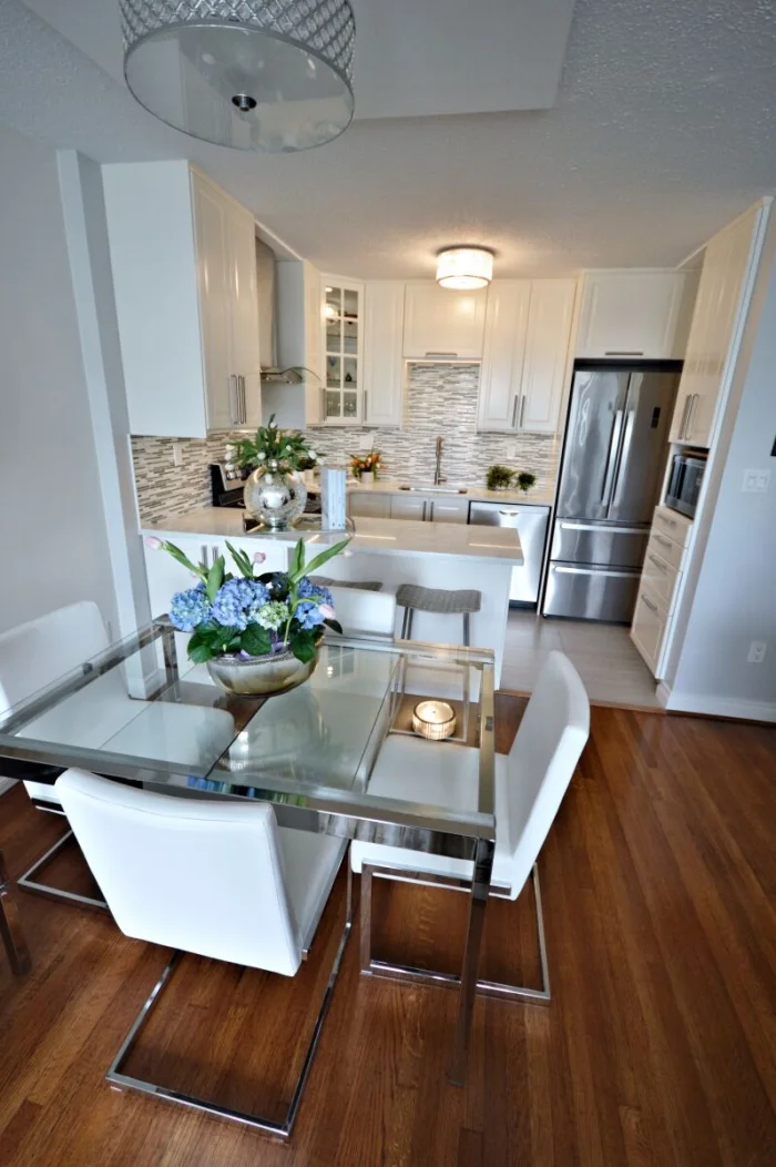 Самый мощный декоративный прием — цвет и принт. Сделайте акцентную стену в обеденной зоне яркими обоями или фотообоями. Белая кухня заиграет совершенно по-новому с сочным бирюзовым, горчичным или глубоким синим фоном.