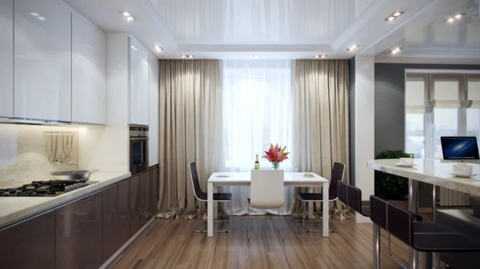 Для больших кухонь с окнами вдали от плиты подойдут и классические длинные шторы. Они добавят мягкости и уюта.