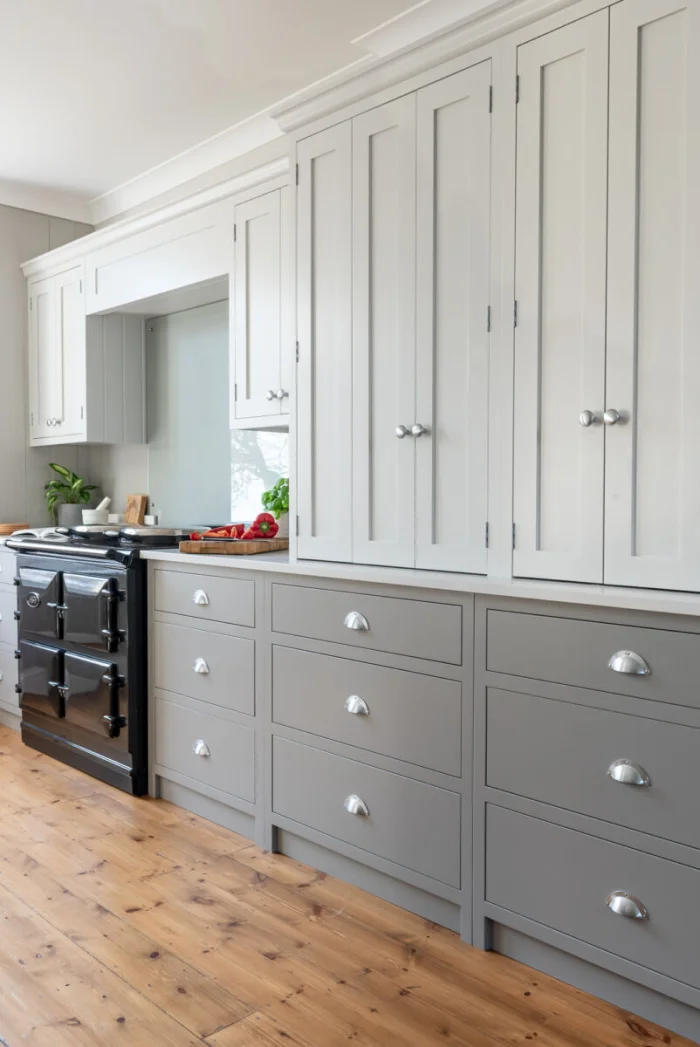 - Комбинировать. Купить базовые шкафы у производителя, а характер придать с помощью уникальной состаренной столешницы, винтажных ручек и открытых полок.