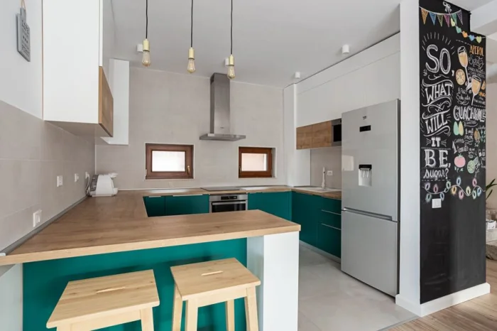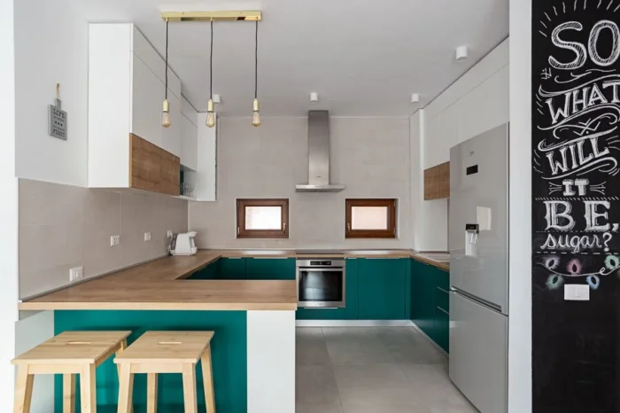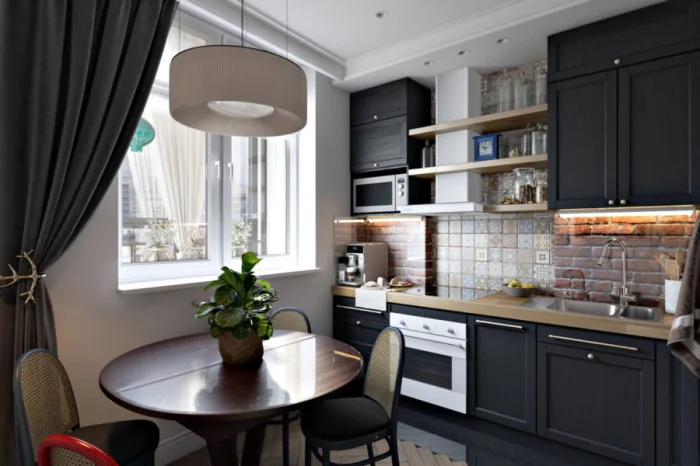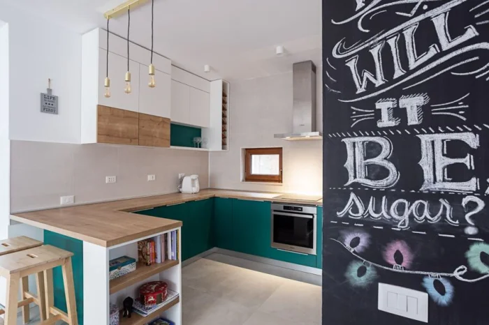 Если 6 квадратных метров начинают угнетать, добавьте игривости. Краска для грифельной доски на фасаде, яркий фартук из метро-плитки, необычный подвесной светильник, стильные ручки. А может, встроенная колонка для музыки? Небольшие, но выразительные детали творят чудеса.
