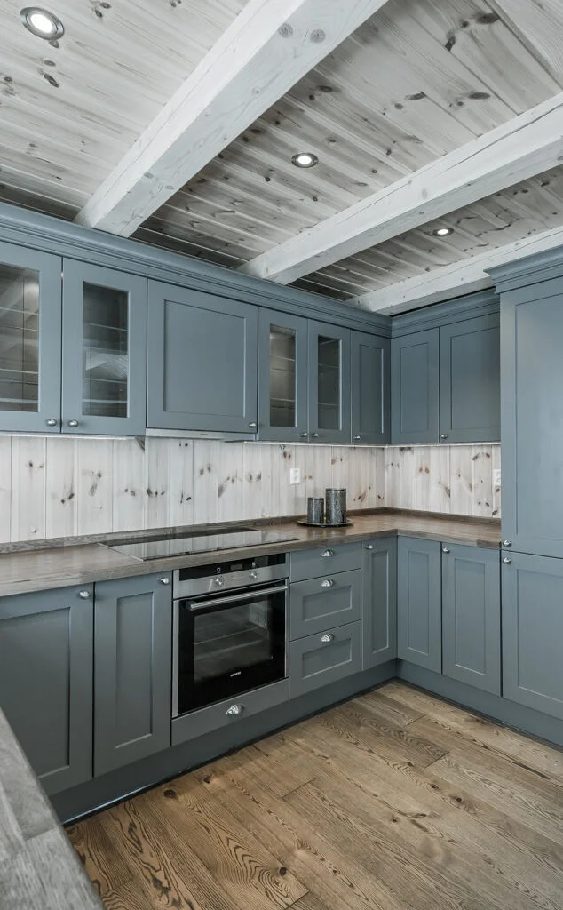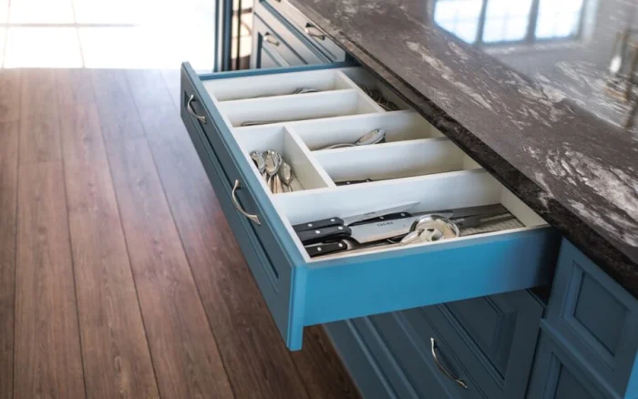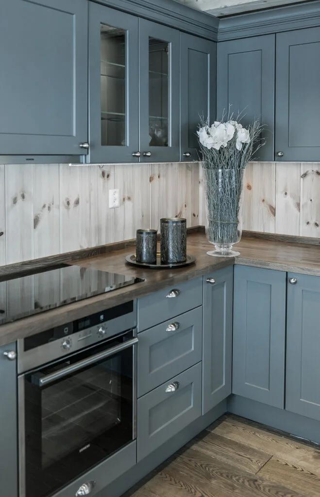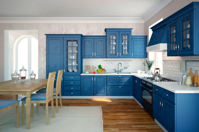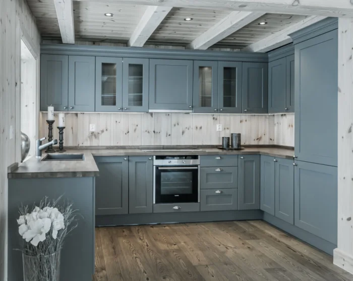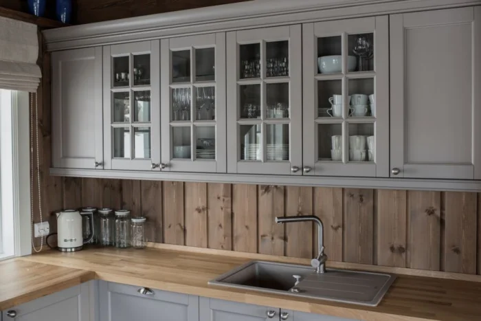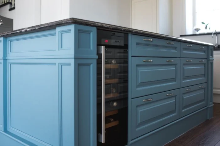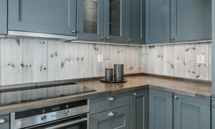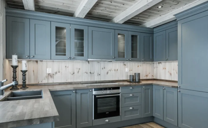 В тренде — фактурные фасады, которые имитируют отделку стен (штукатурка, бетон). Не сдают позиции гладкие матовые поверхности. В цвете правят сложные, приглушённые оттенки: серо-розовый (пыльная роза), серо-зелёный, глубокий сине-зелёный. И, конечно, натуральная фактура дерева и фанеры — вечная классика.