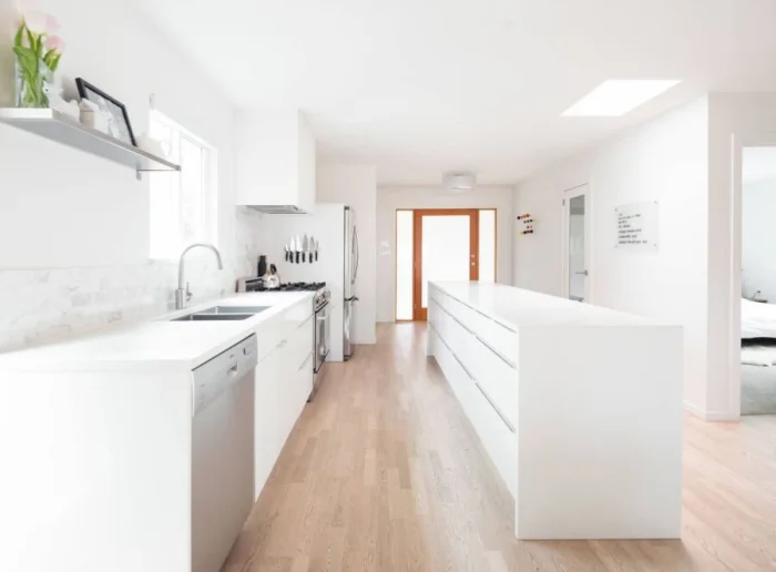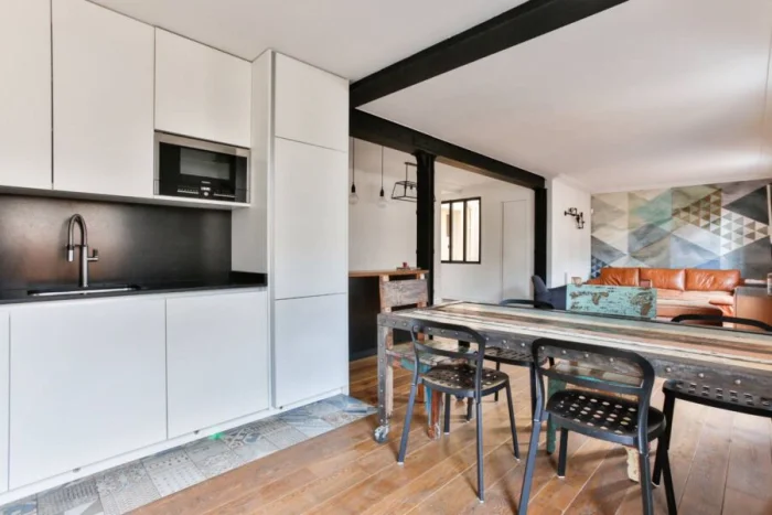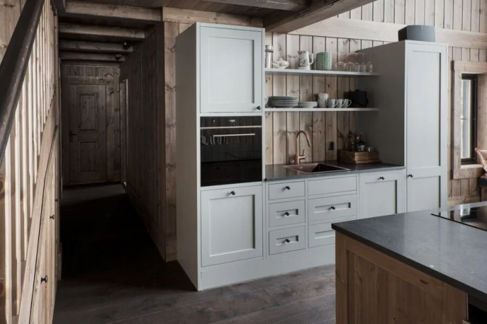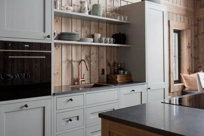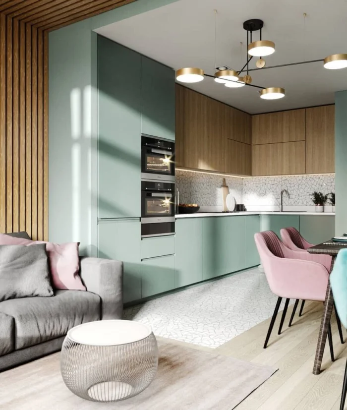 Интересный тренд — полностью скрытый гарнитур. Его можно замаскировать под стену панелями или спрятать в нишу за раздвижной перегородкой. Идеально для кухни-гостиной, чтобы в любой момент превратить рабочую зону в часть гостиной. Идеальный выход для тех, кто не всегда успевает к приходу гостей навести идеальный порядок.