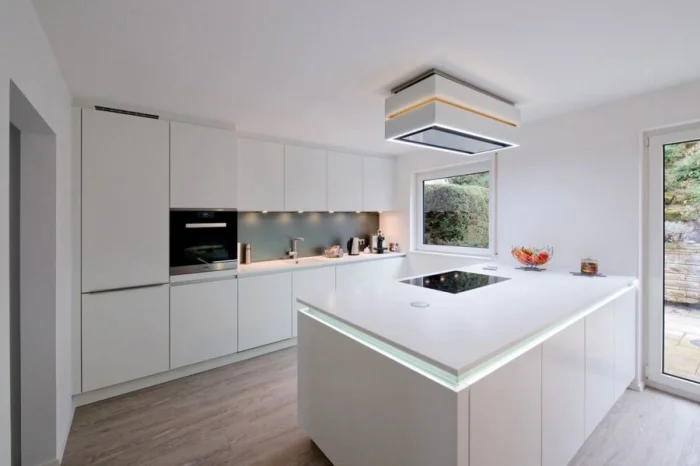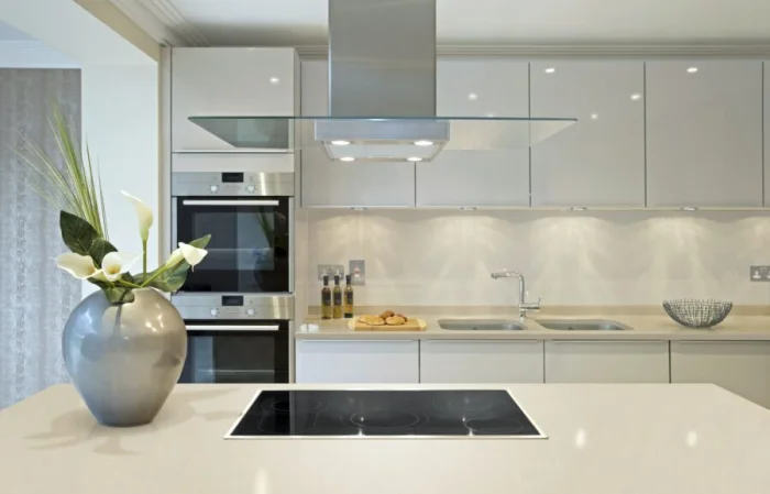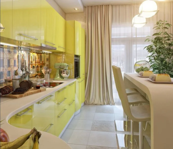 Толстенные каменные плиты сменяются изящными столешницами толщиной около 2 см. Но это не значит, что они хуже. Напротив, технологии позволяют делать их невероятно прочными. Экспериментируйте с цветом: можно сделать её продолжением фасадов или, наоборот, ярким контрастным акцентом.