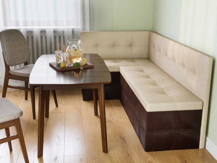 Массивные угловые диваны ушли в прошлое. Их место заняли компактные скамьи или узкие диванчики, которые можно дополнить декоративными подушками или тонким матрасом. Это стильная и эргономичная зона для короткого отдыха или завтрака.