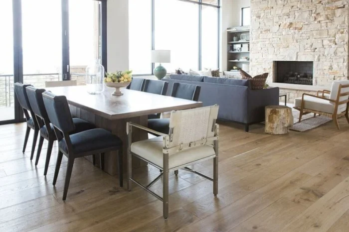 Самый простой и доступный способ зонирования. Идеально сочетается с другими методами. Пол на кухне можно сделать светлее, чем в гостиной. Или использовать разные материалы: практичную плитку в рабочей зоне и уютный ламинат в зоне отдыха.
