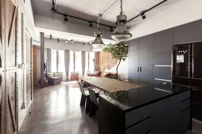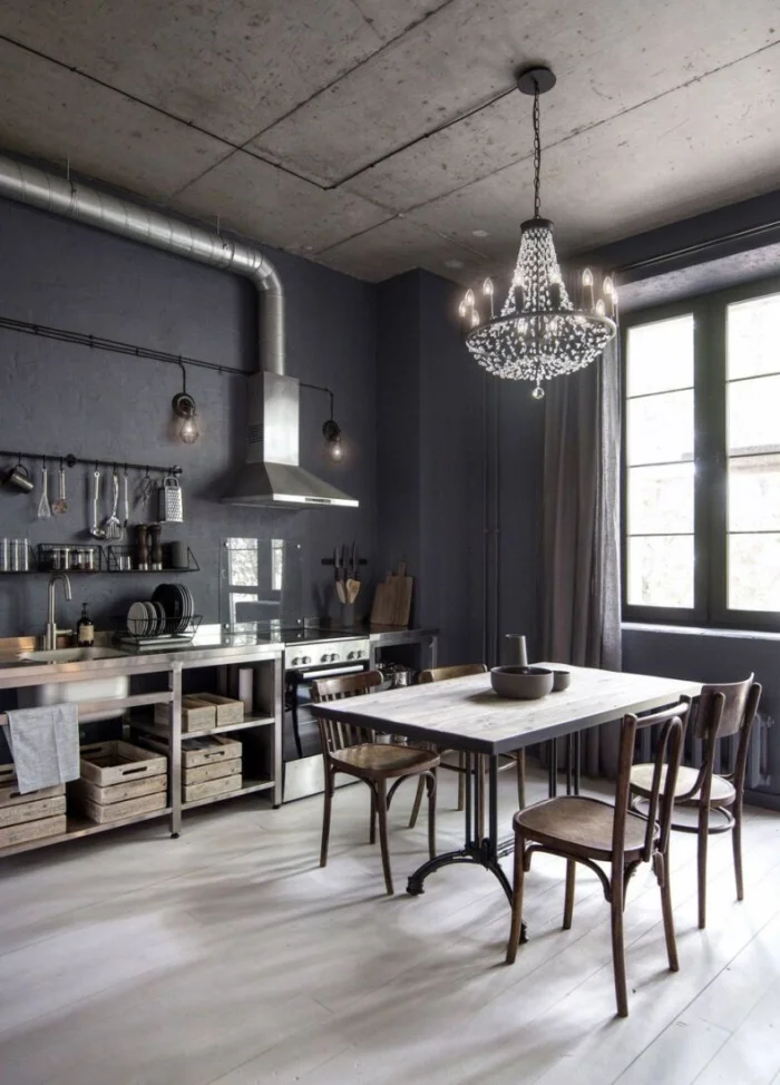 Близкий родственник лофта, но еще более «заводской». Акцент на освещении и металлических деталях: светильники на штативах, металлическая фурнитура. Цвета предпочтительны холодные, без ярких всплесков.