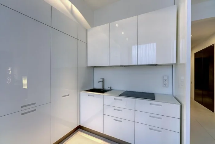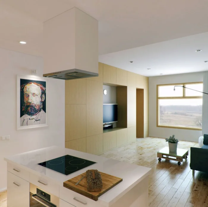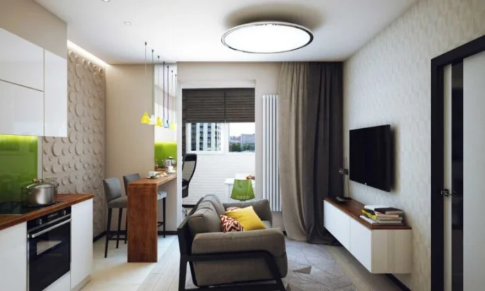 Если же вы питаетесь в основном доставкой, а готовка – necessity, то делайте ставку на зону отдыха. Обустройте уютный диван, большой телевизор, а кухонный блок спрячьте за изящной перегородкой.