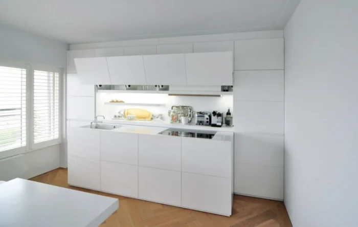 Этот эффектный прием хорош для домов с высокими потолками. Поднять пол на кухне? Звучит круто. Но в низкой хрущевке вы будете постоянно спотыкаться. Идея в том, чтобы готовить на возвышении, а трапезничать – внизу. Готовое блюдо легко «спускается» к гостям. А глянцевые фасады кухни помогут визуально смягчить перепад высот.