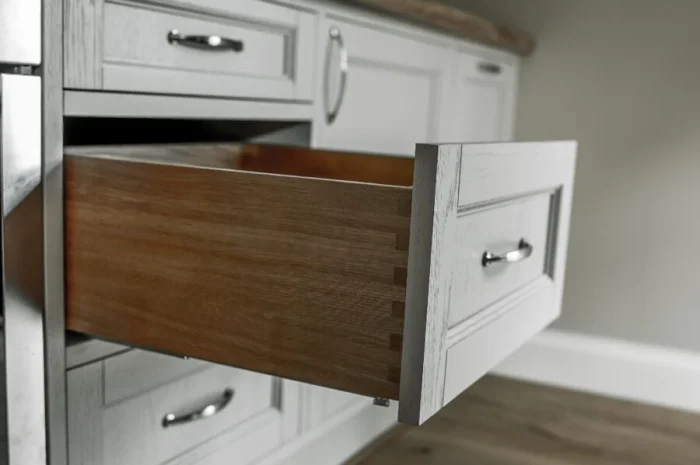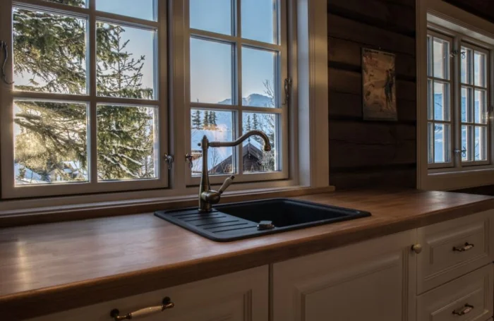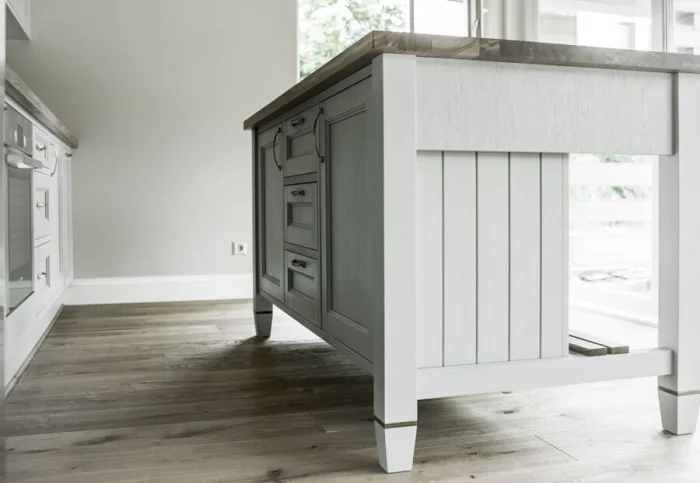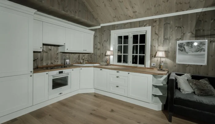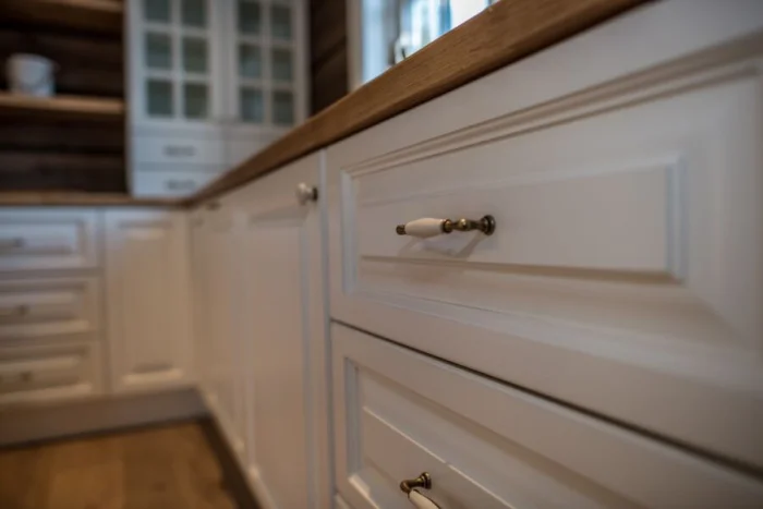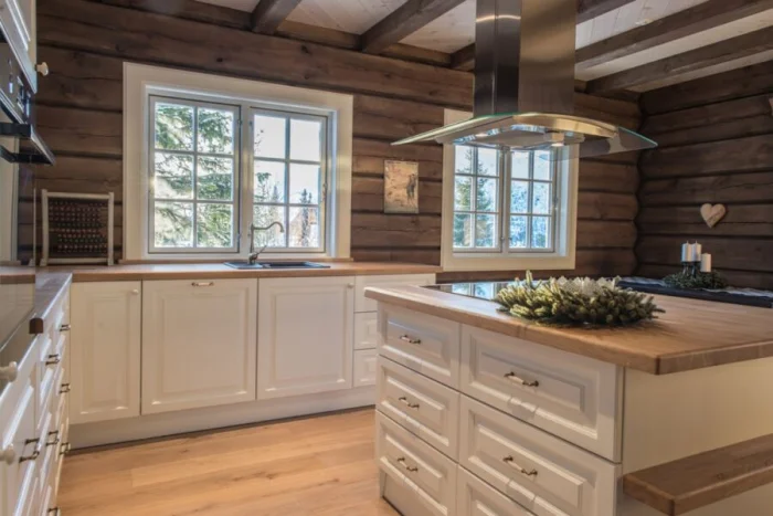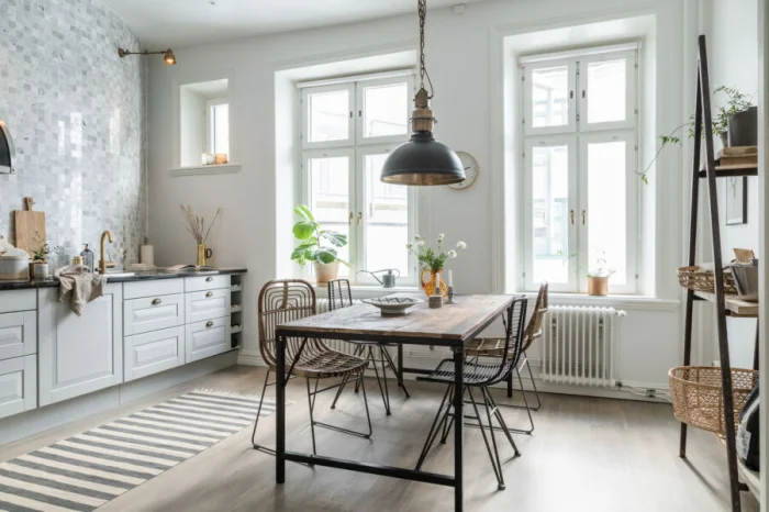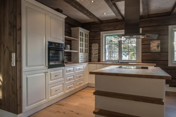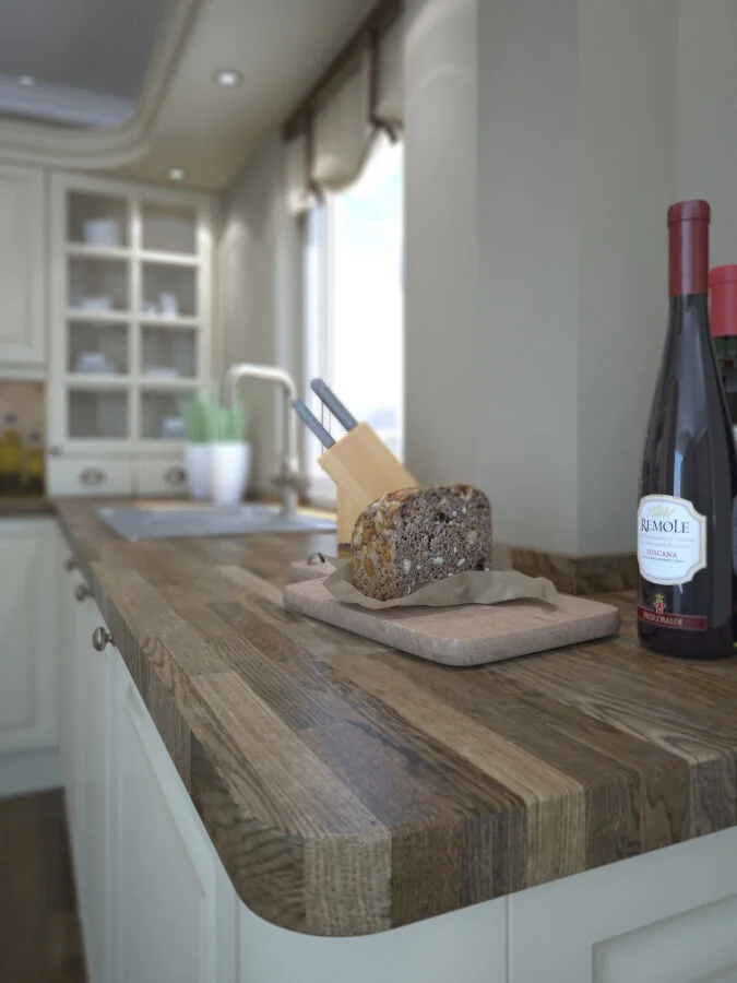 Мебель — массивная, из светлого дерева (ясень, сосна), часто с эффектом патины. Столешница может быть контрастной, темной, например, из темного камня или мраморированного пластика.