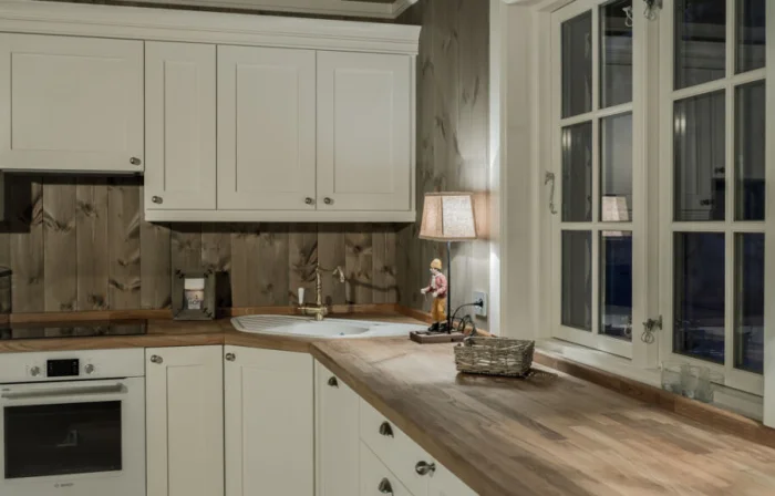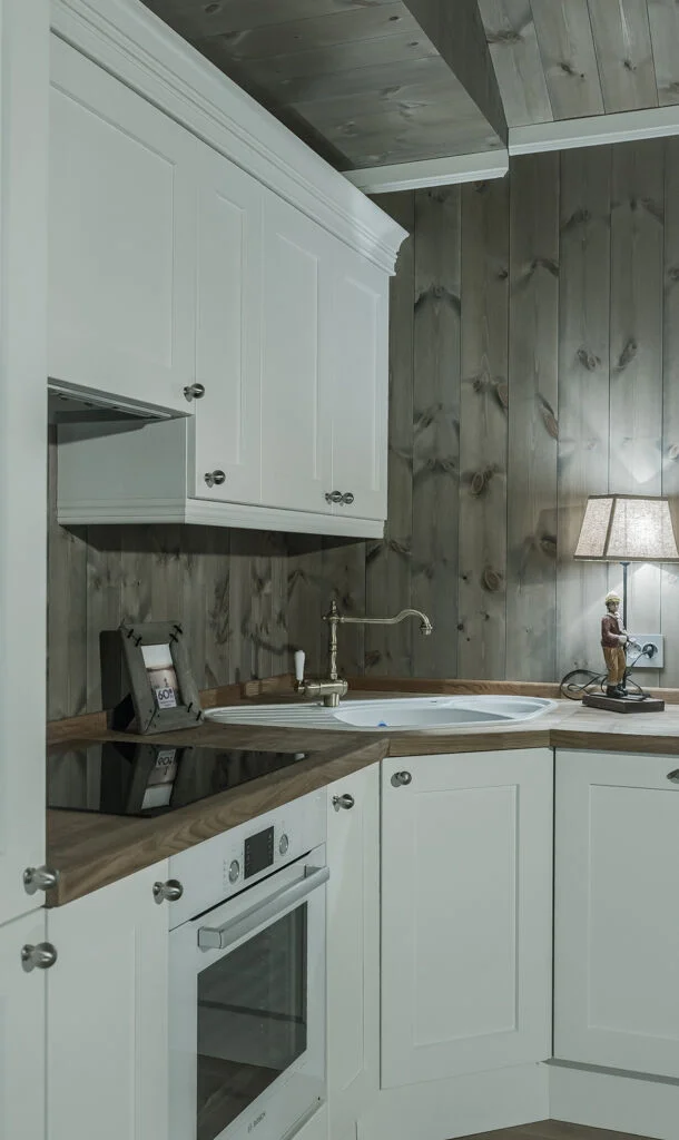 Этот стиль — гимн неспешной, уютной жизни. Он идеален для создания теплой, «обжитой» атмосферы. В основе — только натуральные материалы: дерево на полу и фасадах, камень или керамика на фартуке.