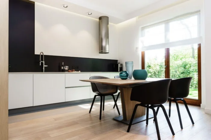 Рулонные или римские шторы — беспроигрышный вариант для современной кухни. Они дозируют свет, не собирают запахи и выглядят максимально аккуратно. Простота — это и есть высшая форма элегантности, не так ли?