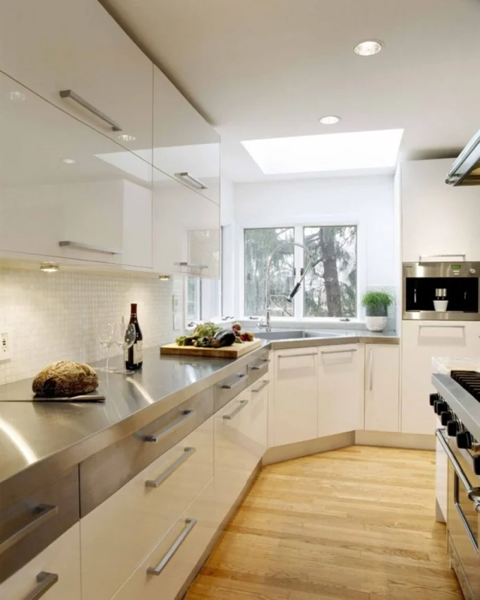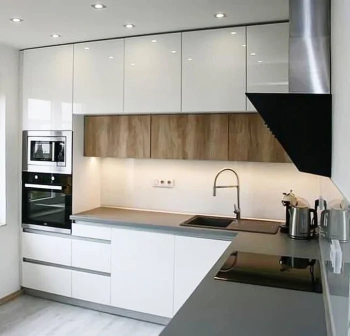Глянцевые или матовые фасады, зеркальные вставки, металлические элементы — эти поверхности отражают свет и визуально расширяют помещение. Вот почему минимализм так любят владельцы маленьких кухонь.