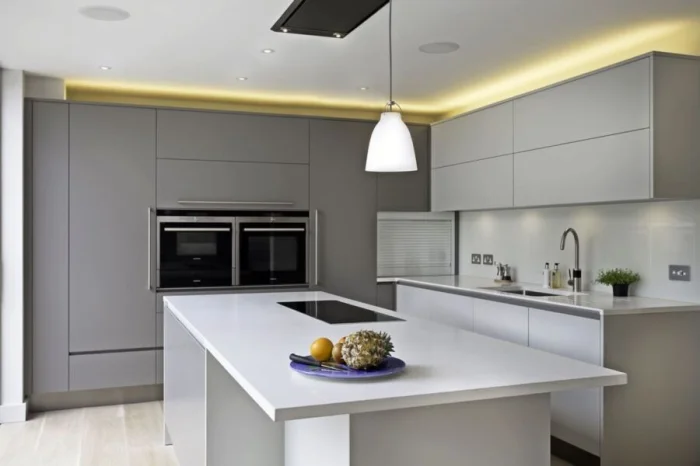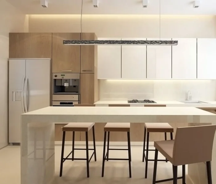 Вся техника полностью встраивается, ручки на фасадах часто отсутствуют (используется система push-open). Освещение продумывается до мелочей: скрытая светодиодная лента, точечные потолочные светильники, строгие подвесы над барной стойкой.