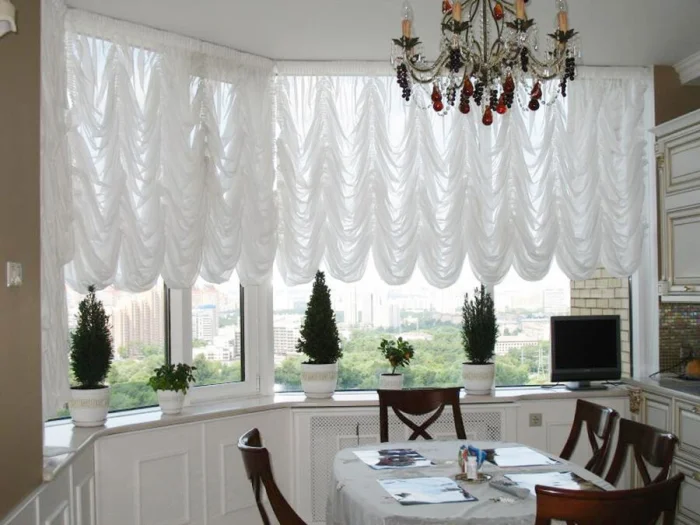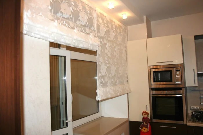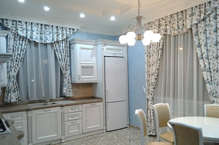 - Арт-деко: Можно позволить себе лаконичный ламбрекен в паре с тюлем. Но для маленькой кухни от сложных конструкций лучше отказаться.