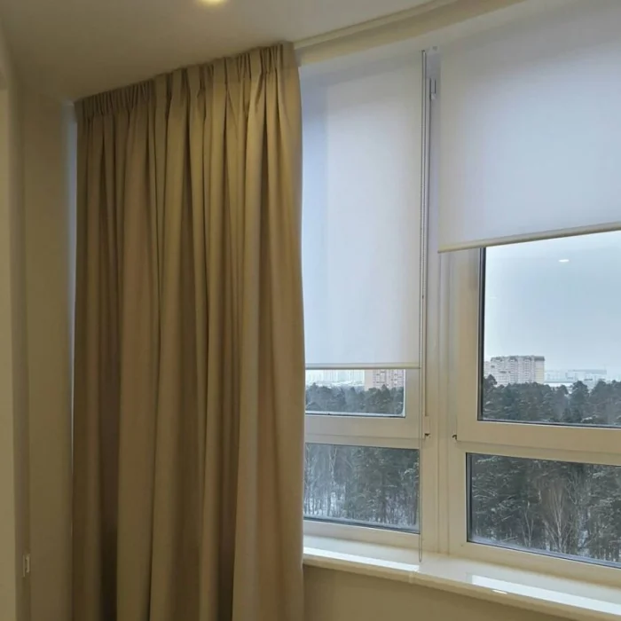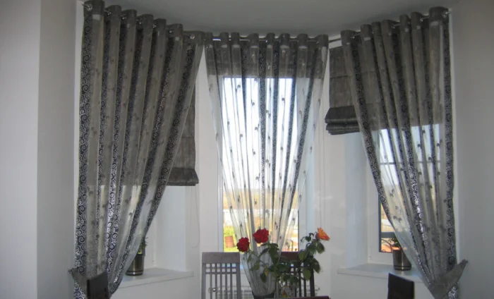 Красиво смотрится и комбинация: легкий тюль в пол + практичная римская штора. Одно не мешает другому, и всегда можно варьировать степень освещенности.