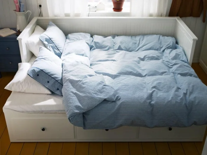 Бывают «французские» (раскладываются в три сложения) и «американские» (более компактные). Особенность — спать вы будете, упираясь головой в спинку дивана.