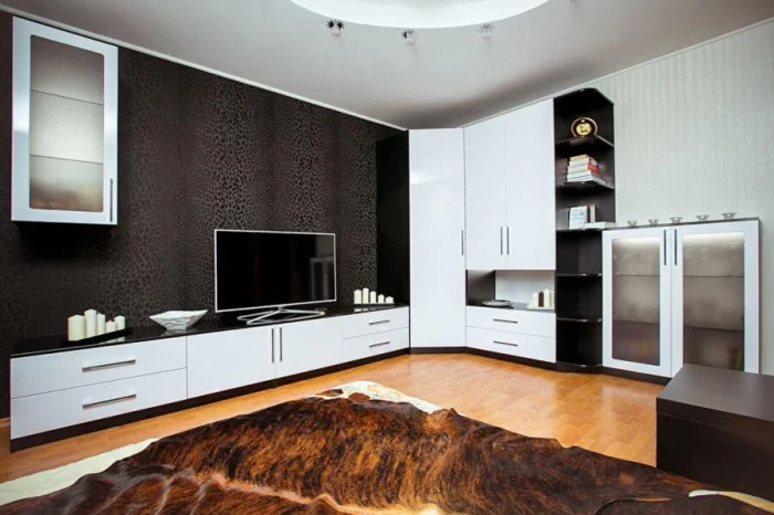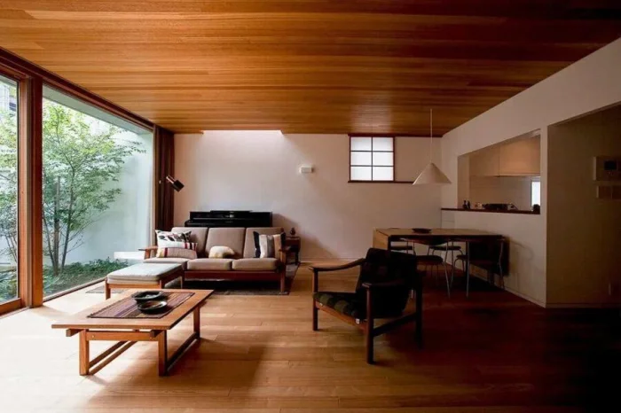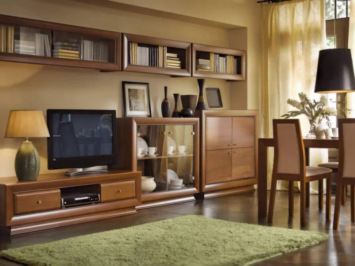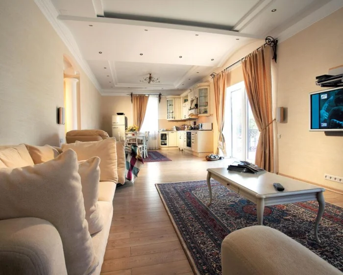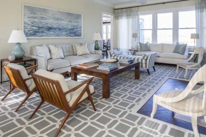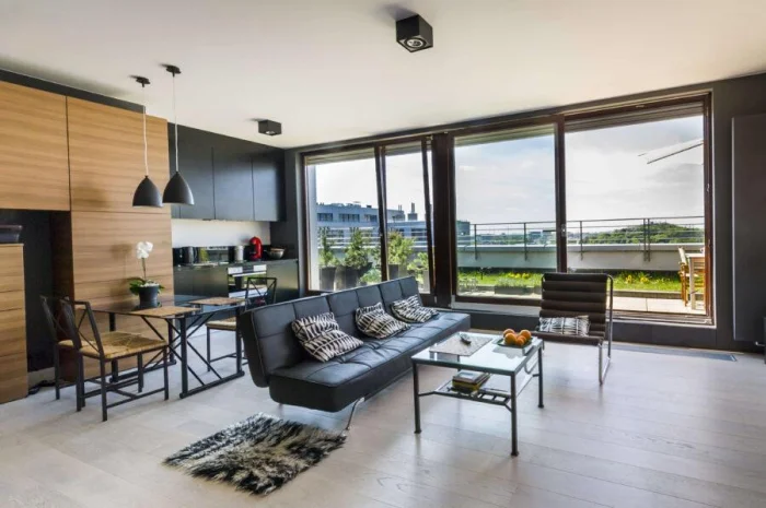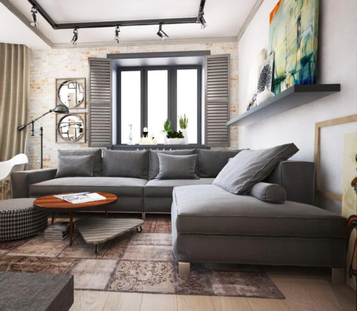 - Зонирование без стен. Используйте ковры, низкие стеллажи или просто сочетание разных напольных покрытий (например, паркет и плитка). Это делит пространство, но не «крадет» его.