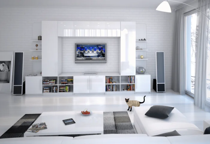 - Мебель с гладкими, монолитными фасадами. Идеально — без ручек и лишнего декора. Чистые линии создают ощущение порядка.