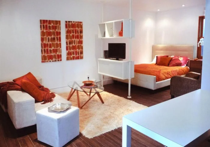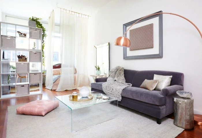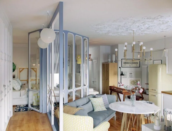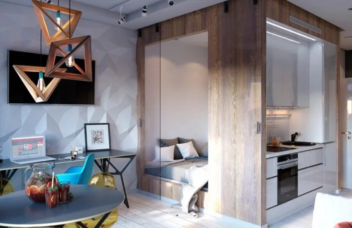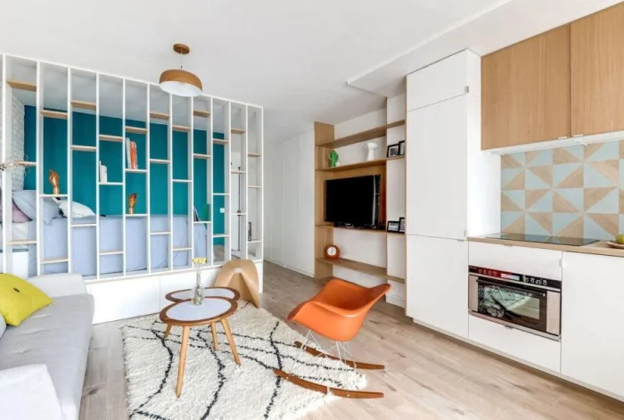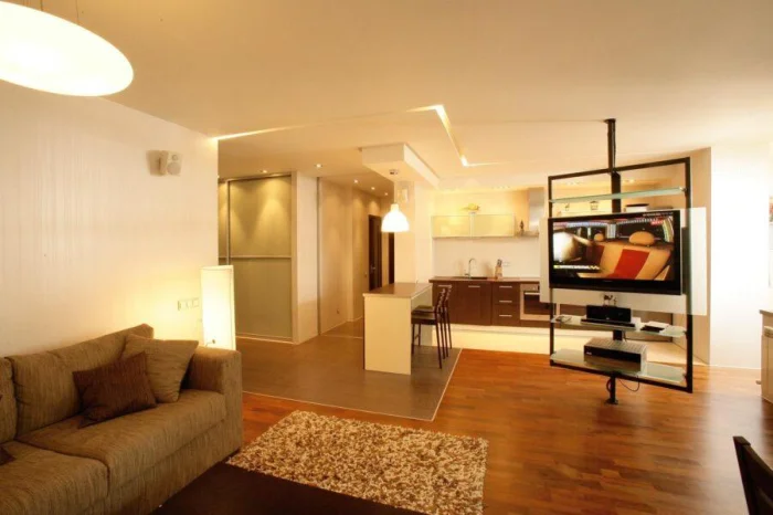 Как это сделать? Барной стойкой между кухней и гостиной, ширмой у кровати, подиумом, выделяющим зону отдыха. Прозрачные перегородки, стеллажи, текстиль, разное напольное покрытие — инструментов масса.