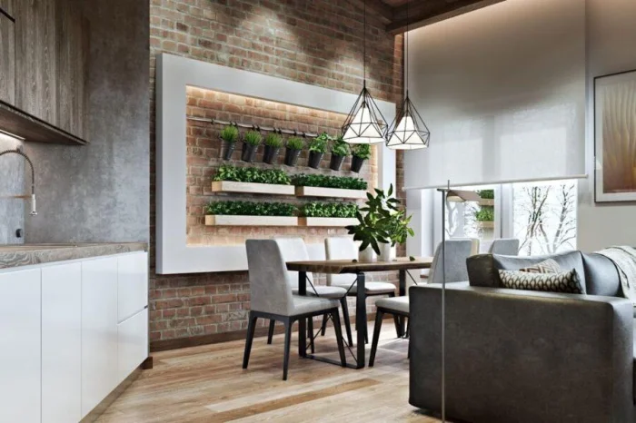 Лофт и индустриальные мотивы никуда не делись, но стали более утончёнными. Это стиль для смелых: открытые коммуникации, бетон, металл, кирпичная кладка, геометричные принты.