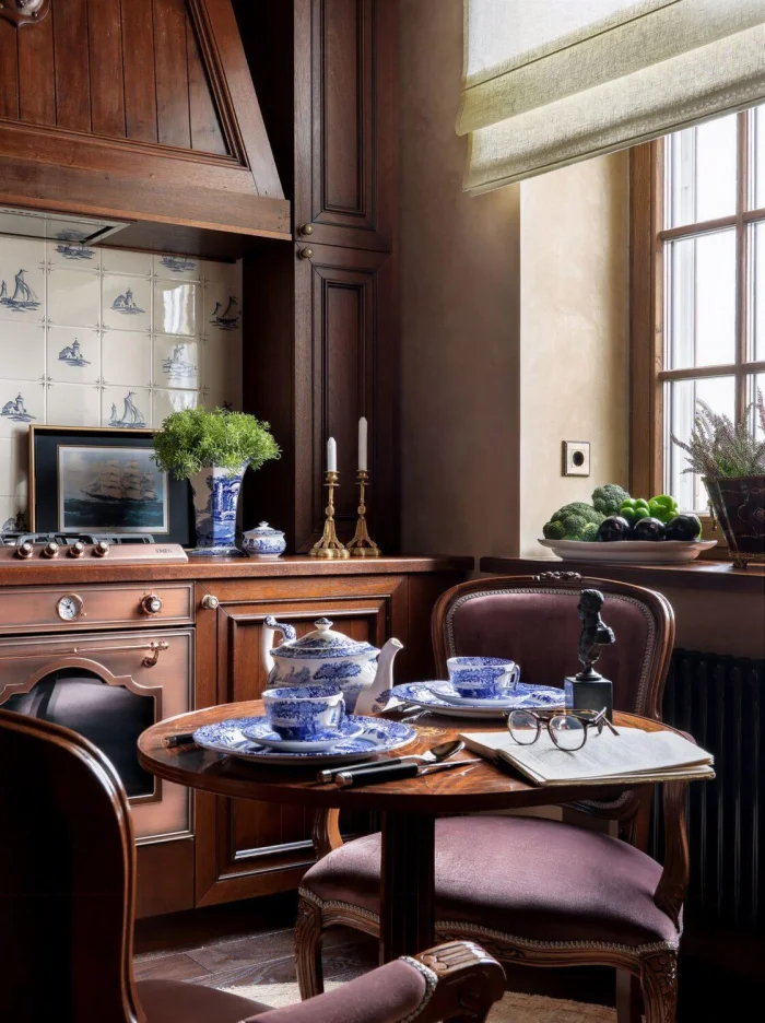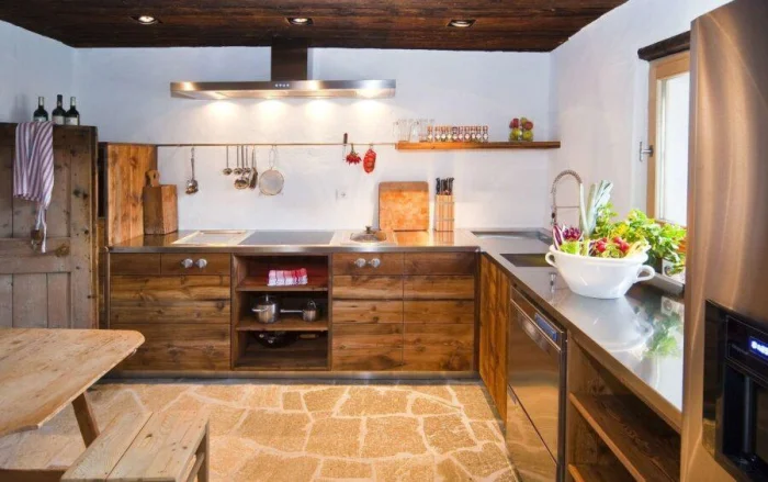 Деревянные панели, каменные столешницы, льняной текстиль, неглазурованная керамика — всё это создаёт тёплую, дышащую атмосферу.