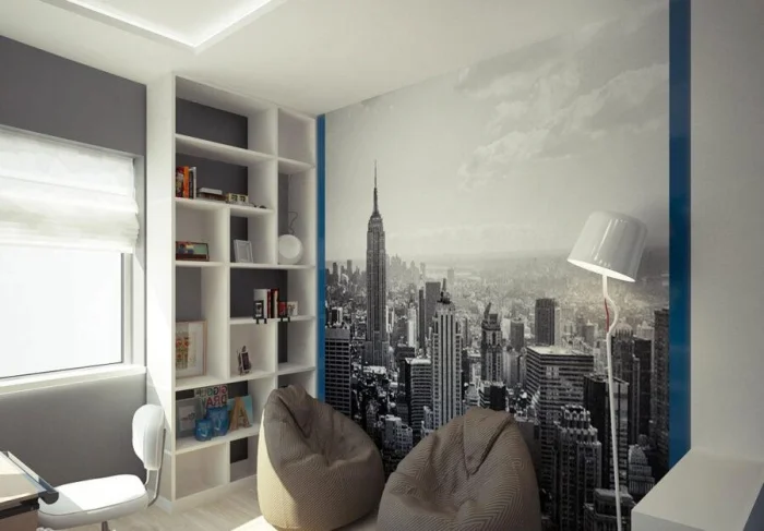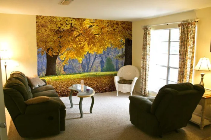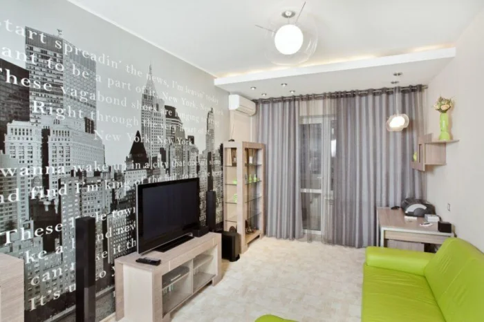 И помните золотое правило: одна стена – актриса, остальные – фон. Остальные поверхности покрасьте в тон, взятый с фотообоев. Так интерьер будет цельным, а картина на стене не станет рябить в глазах.