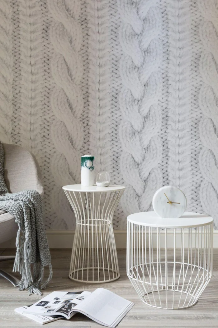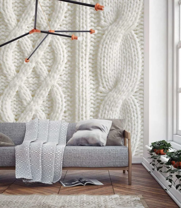 Вот уж что выглядит необычно, но чертовски уютно! Эти обои – точная имитация ручной вязки спицами или крючком. Представьте: на стене будто висит огромная, невероятно стильная ажурная салфетка. Играть с этой идеей – одно удовольствие: подхватите узор пледом на диване или вязаными подушками.