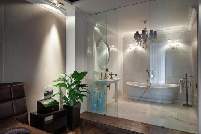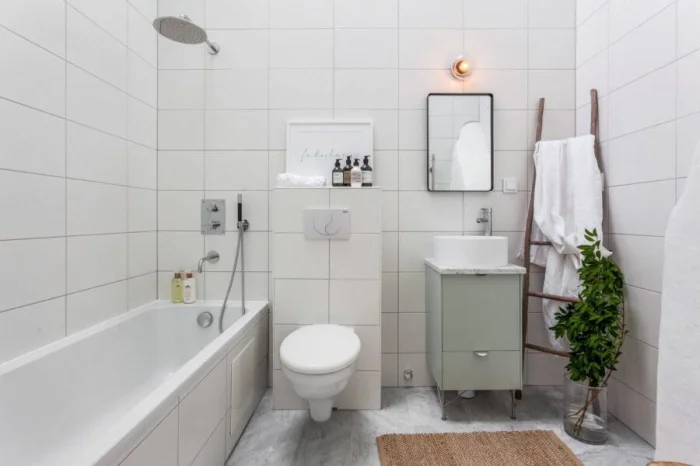 Уют создают детали. Небольшая картина в влагозащищённом багете, полка с любимой косметикой, живое растение (папоротник, сциндапсус, орхидея — они любят влажность). Их можно разместить на стене, на полу или даже подвесить к потолку.
