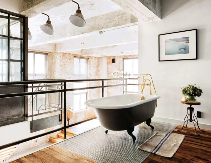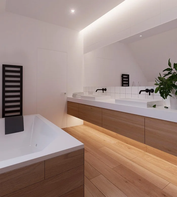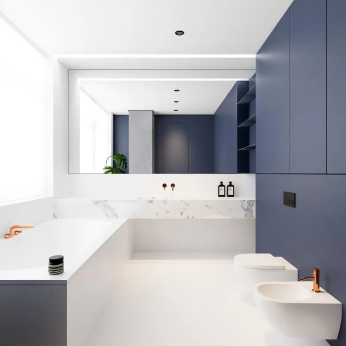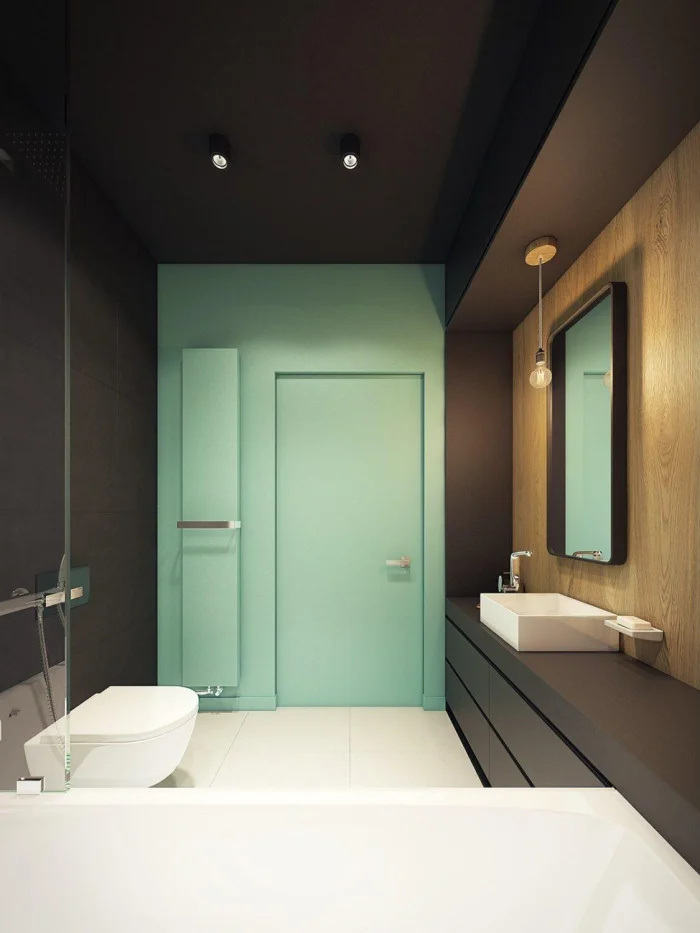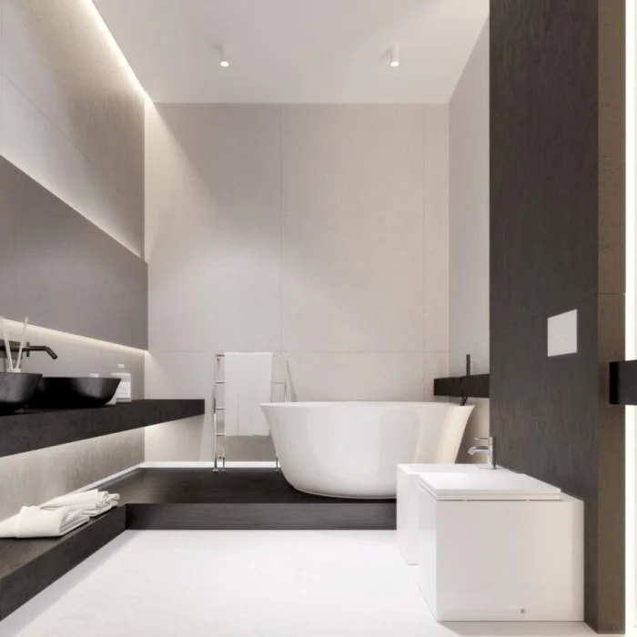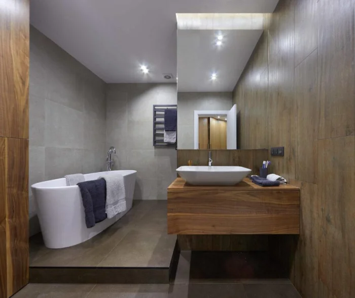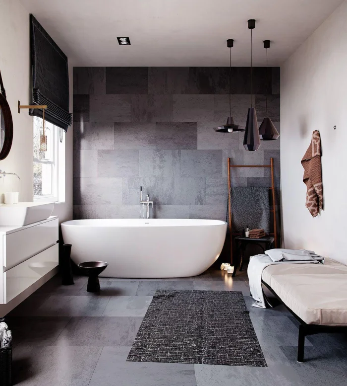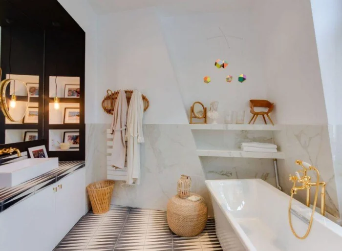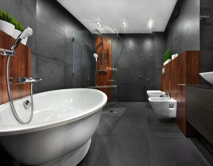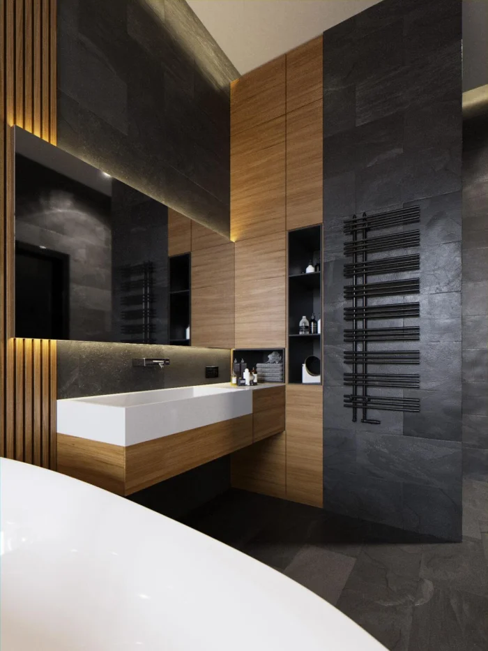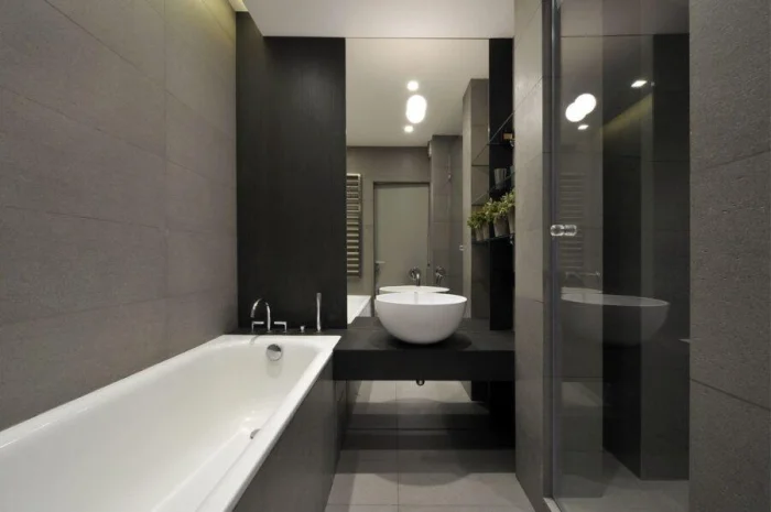 Идеально, если раковина и ванна выполнены в одном стиле, образуя гармоничный ансамбль. Или наоборот — сыграйте на контрасте: тёмные стены и белоснежная ванна создают эффектный, почти театральный образ.