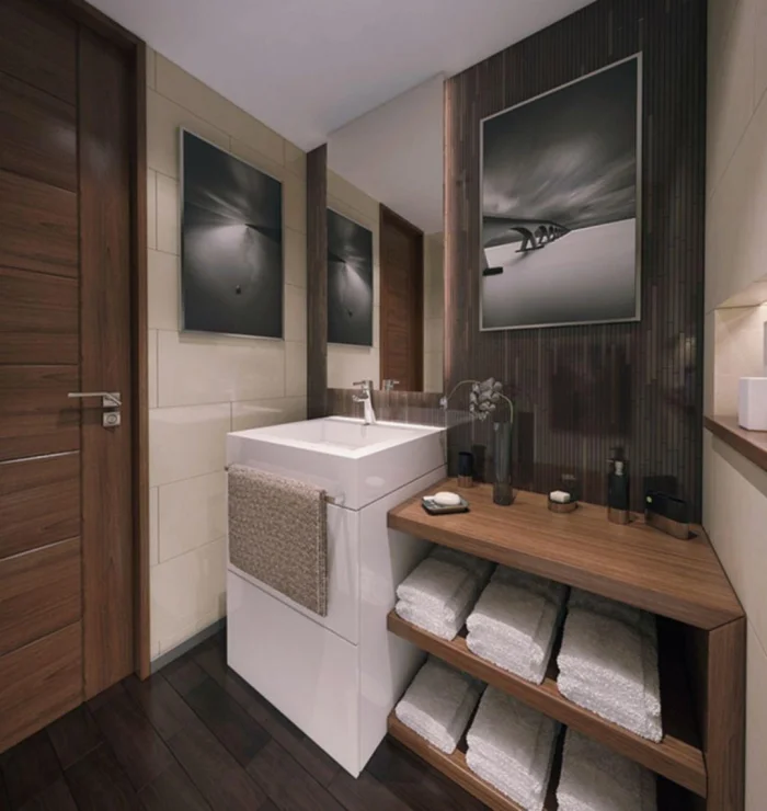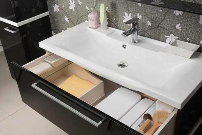 Шкафчики и тумбы должны быть максимально вместительными, чтобы спрятать всё, что портит вид: баночки, тюбики, запасные полотенца. Аккуратность — новый тренд. Особенно популярны конструкции на изящных ножках: они не «съедают» пространство, а кажется, будто парят над полом.