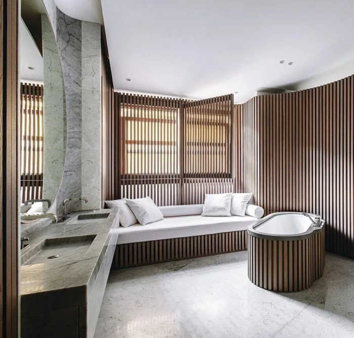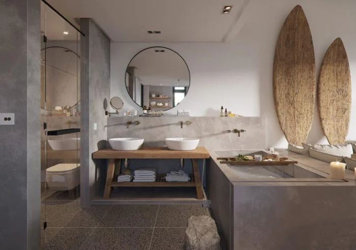 Философия 2023 года: лаконичность, функциональность и спокойствие. Чёткие формы, продуманные детали и пастельная, природная палитра создают атмосферу спа-центра у вас дома.